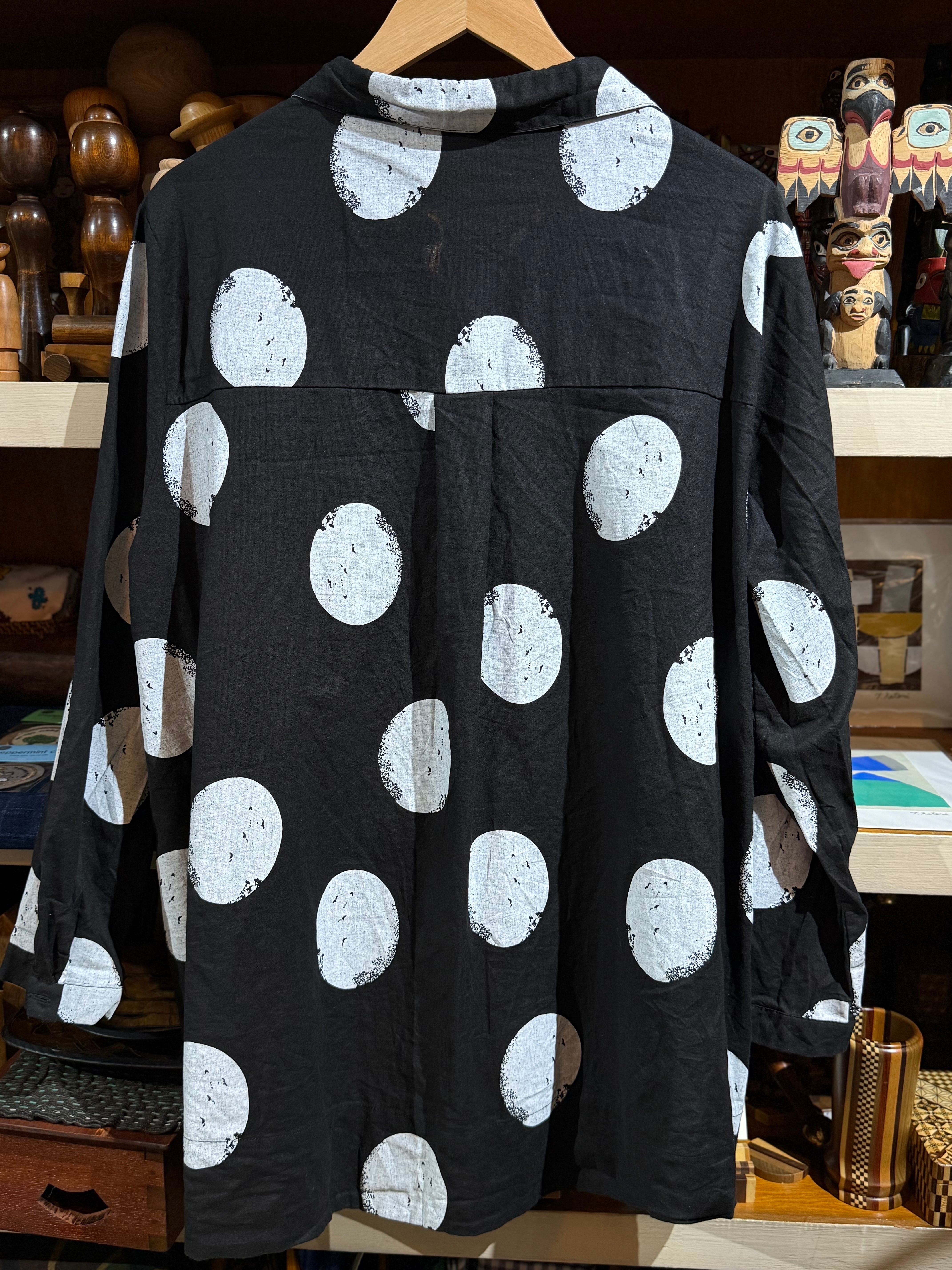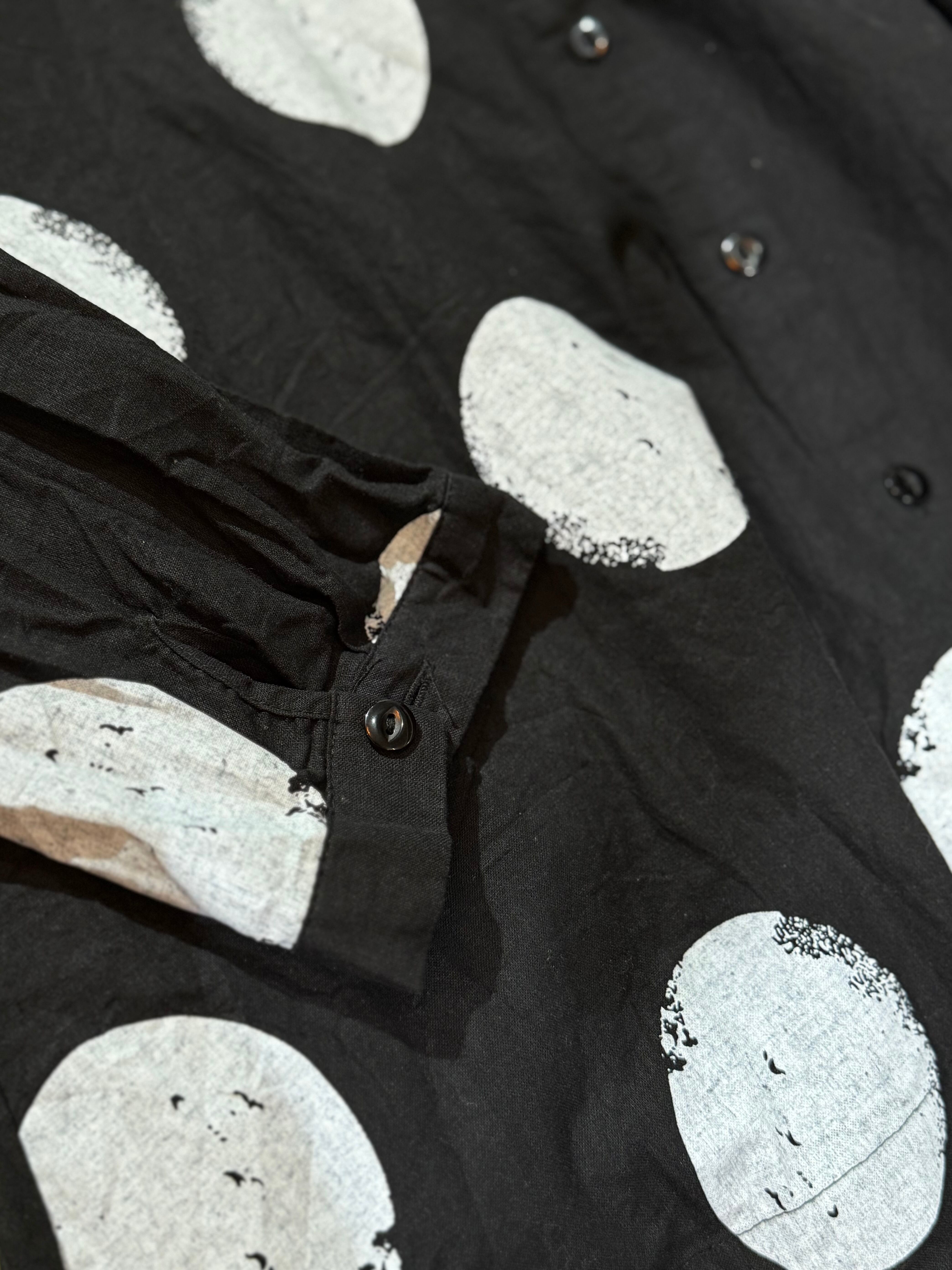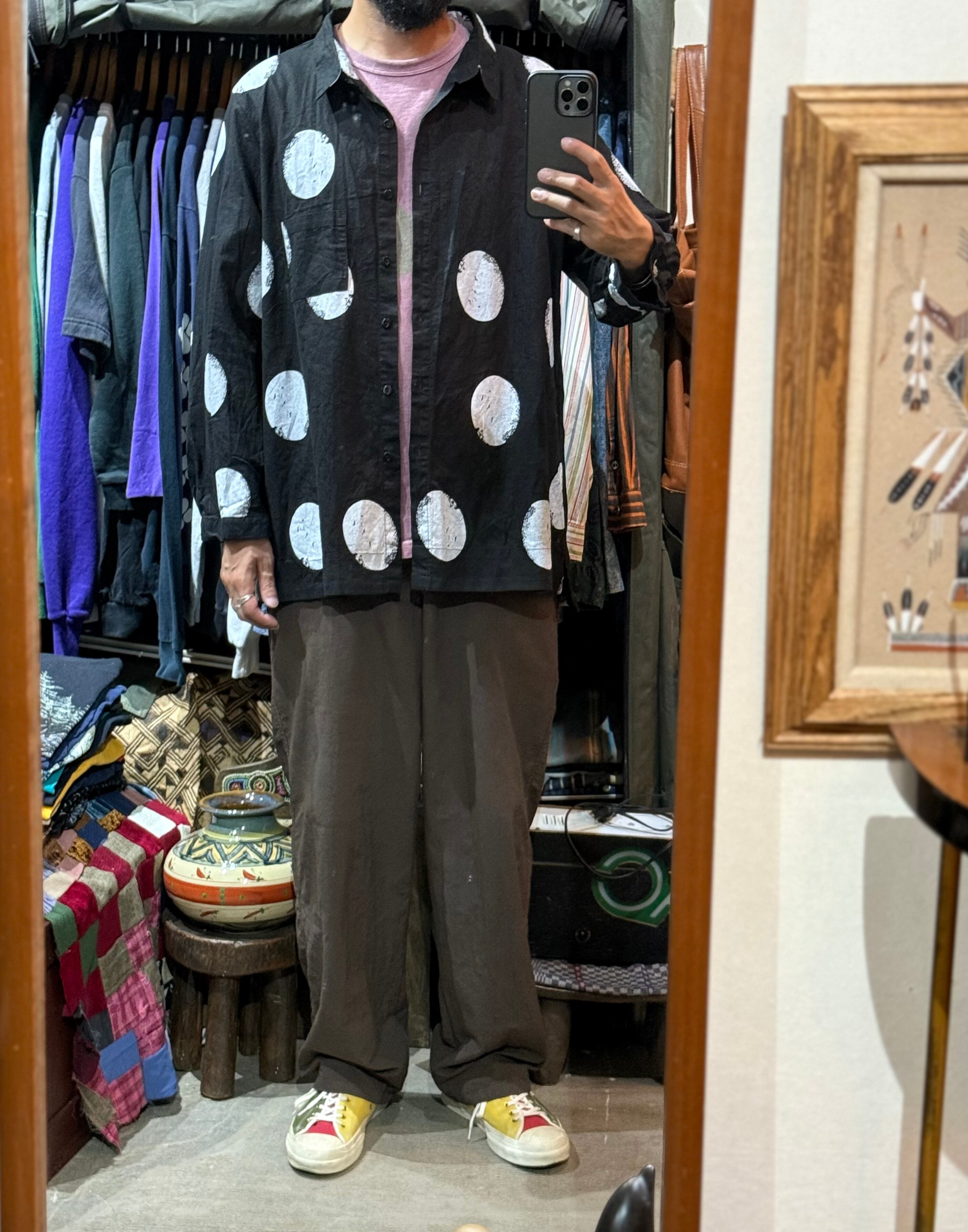 かすれたポルカドットのプリントが映える羽織のシャツです。