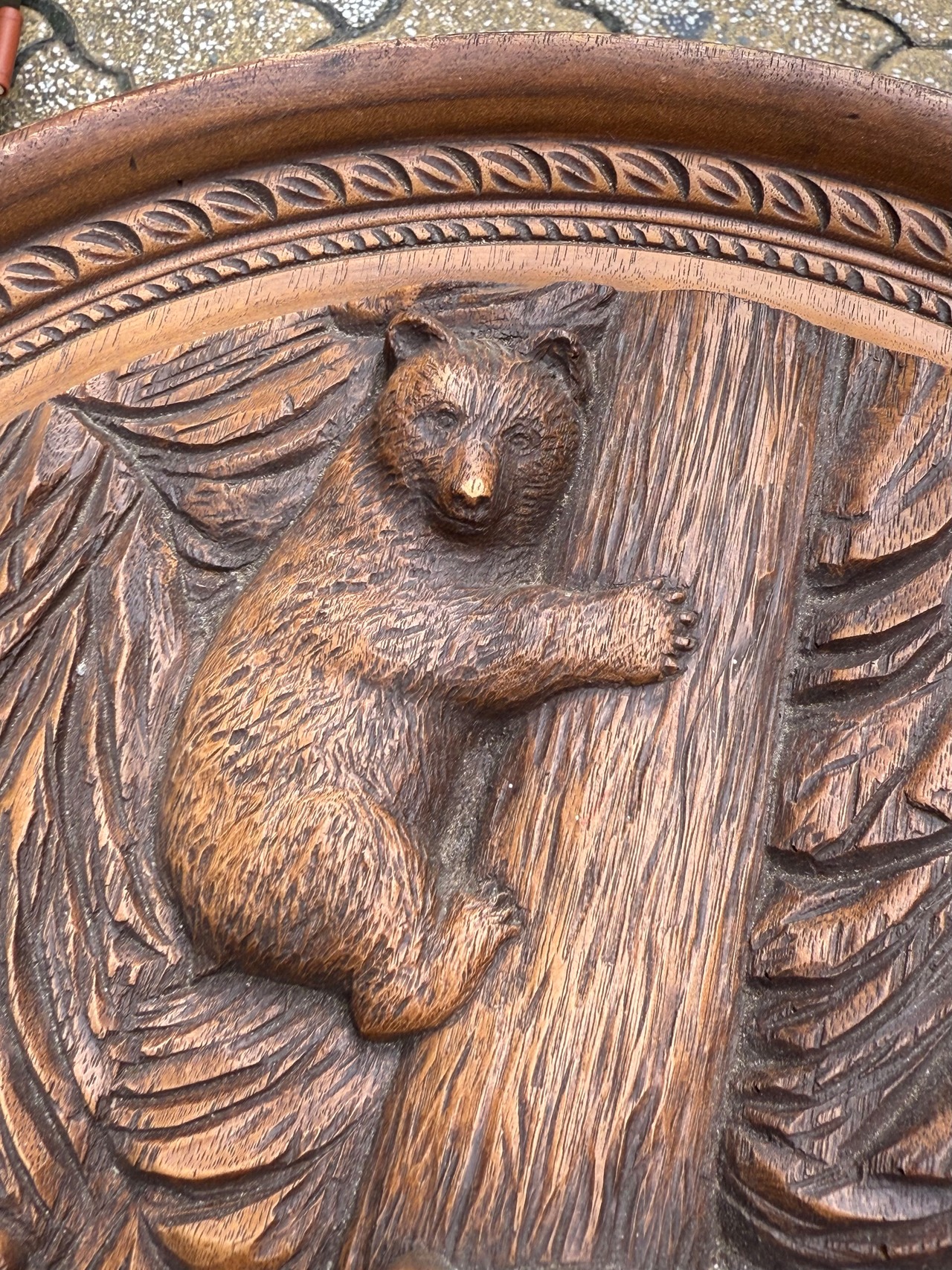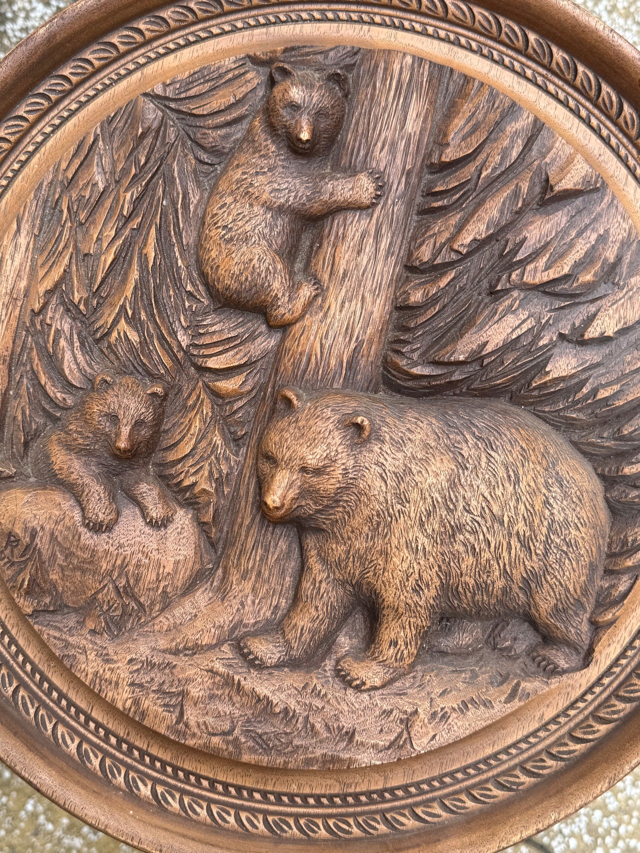 丁寧かつ立体的に熊の親子が彫られています。