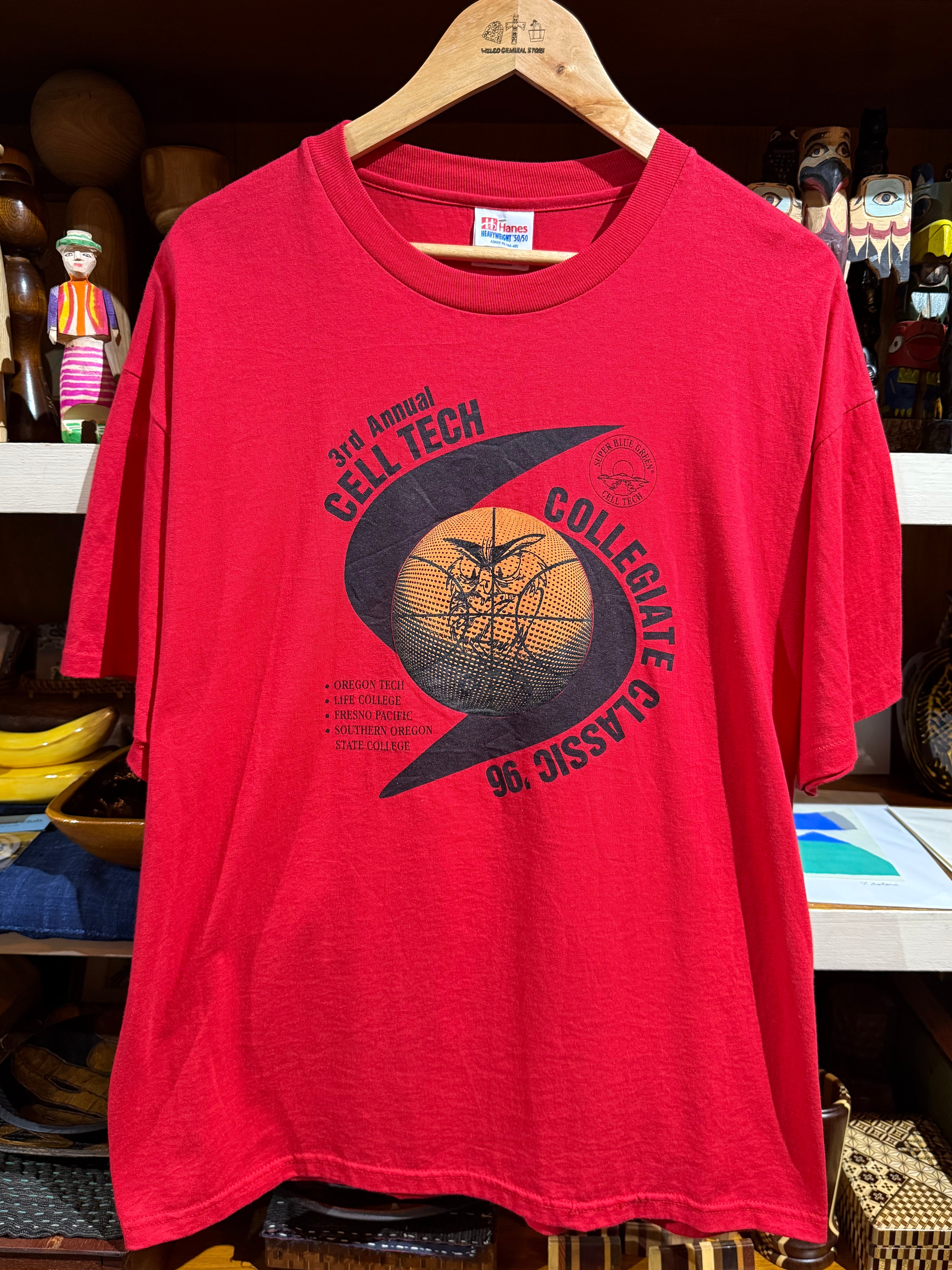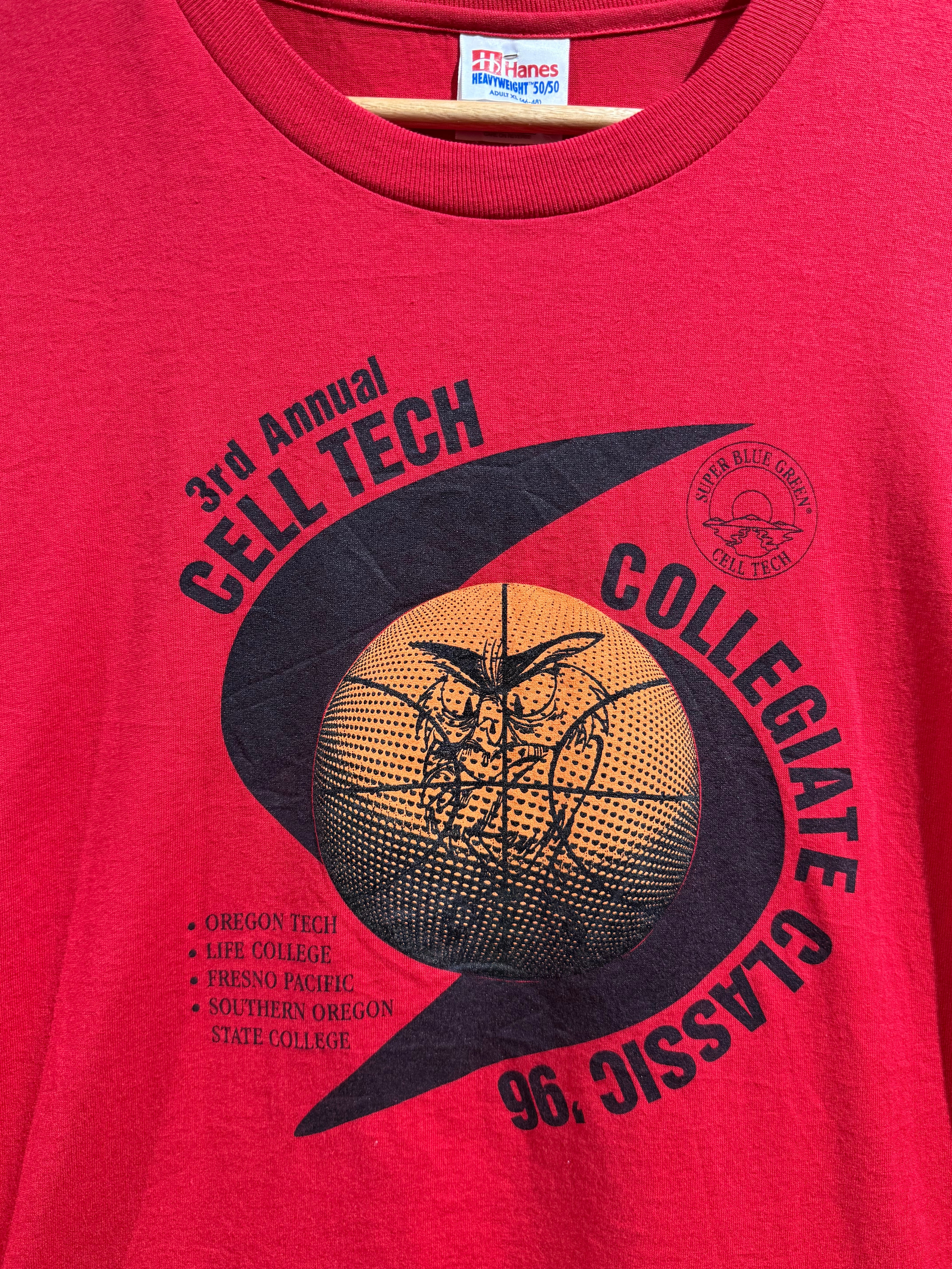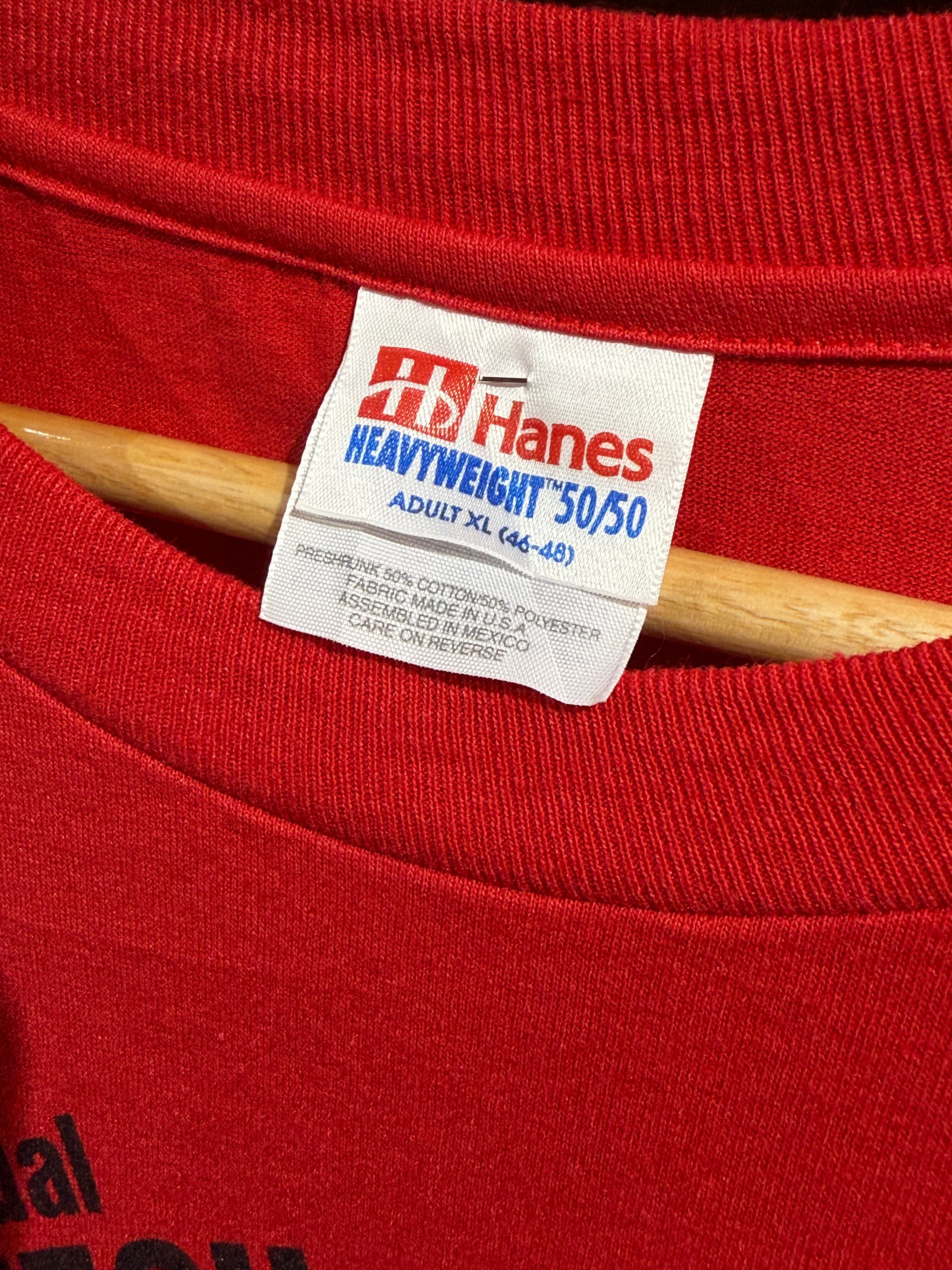 スポーツ系ではなくて、学問系のイベントTシャツにもグッドデザインが見受けられますが、こちらも赤いボディにバランスの良いデザインが映える一枚です。