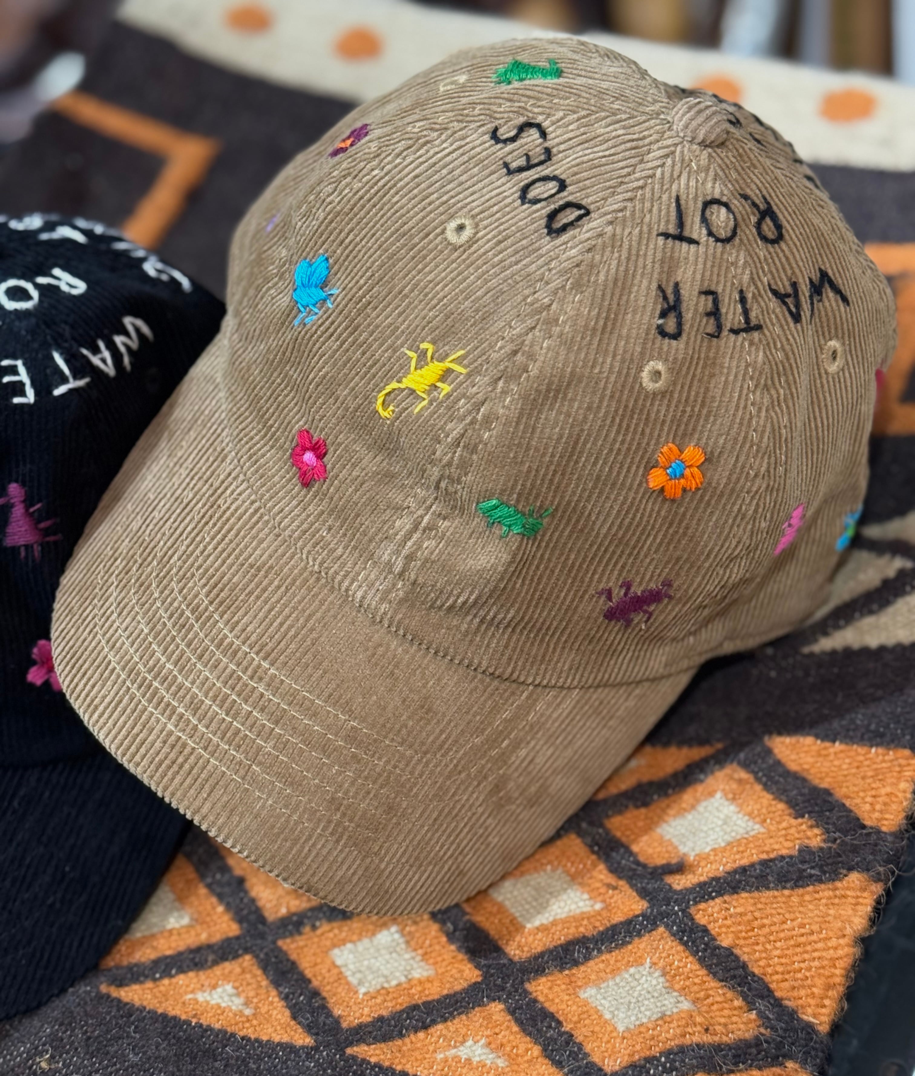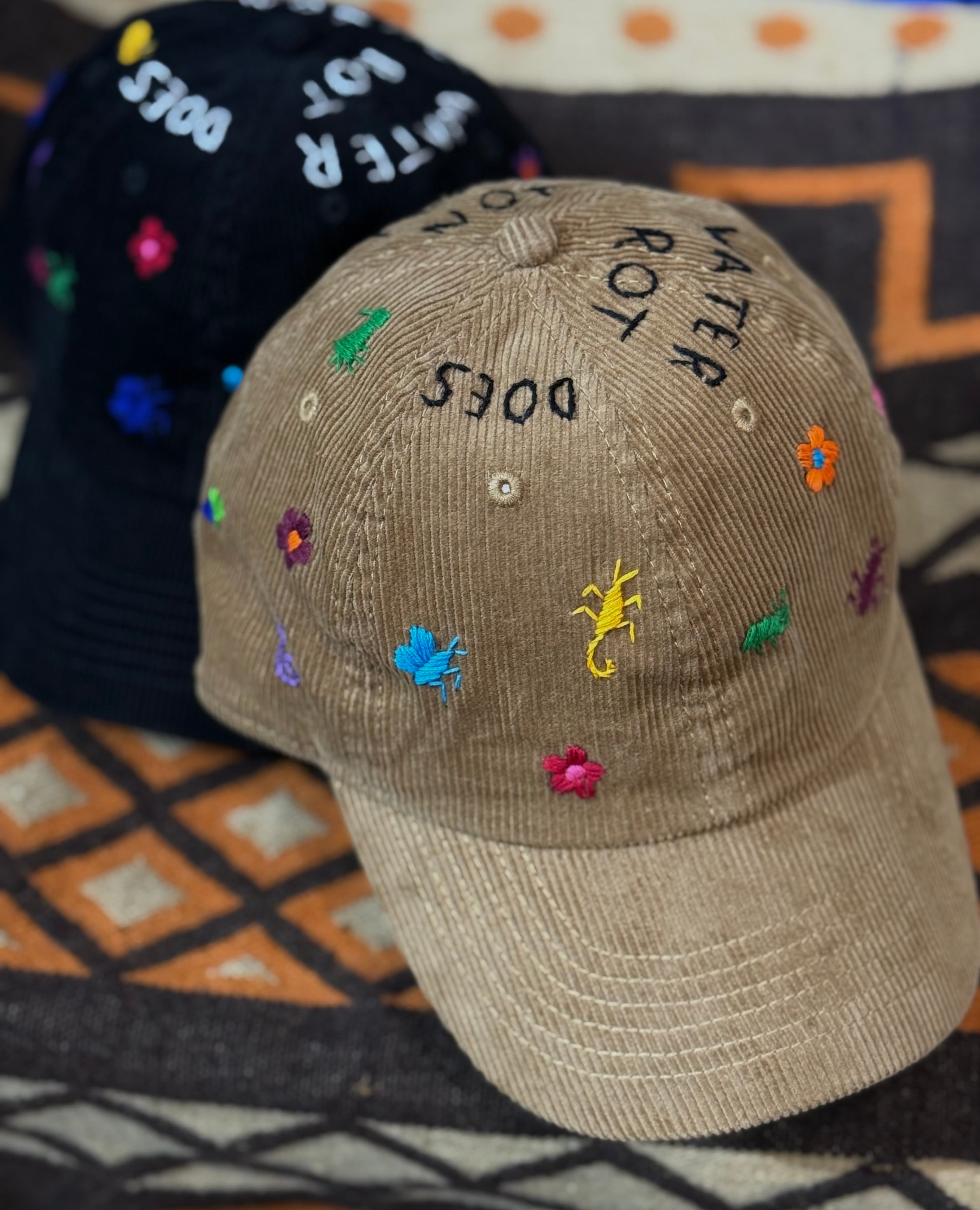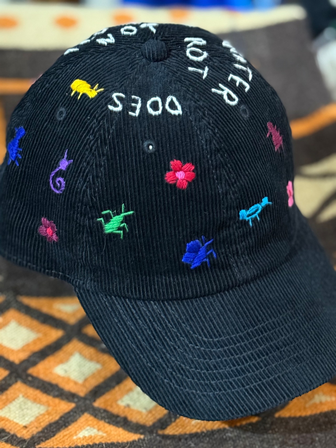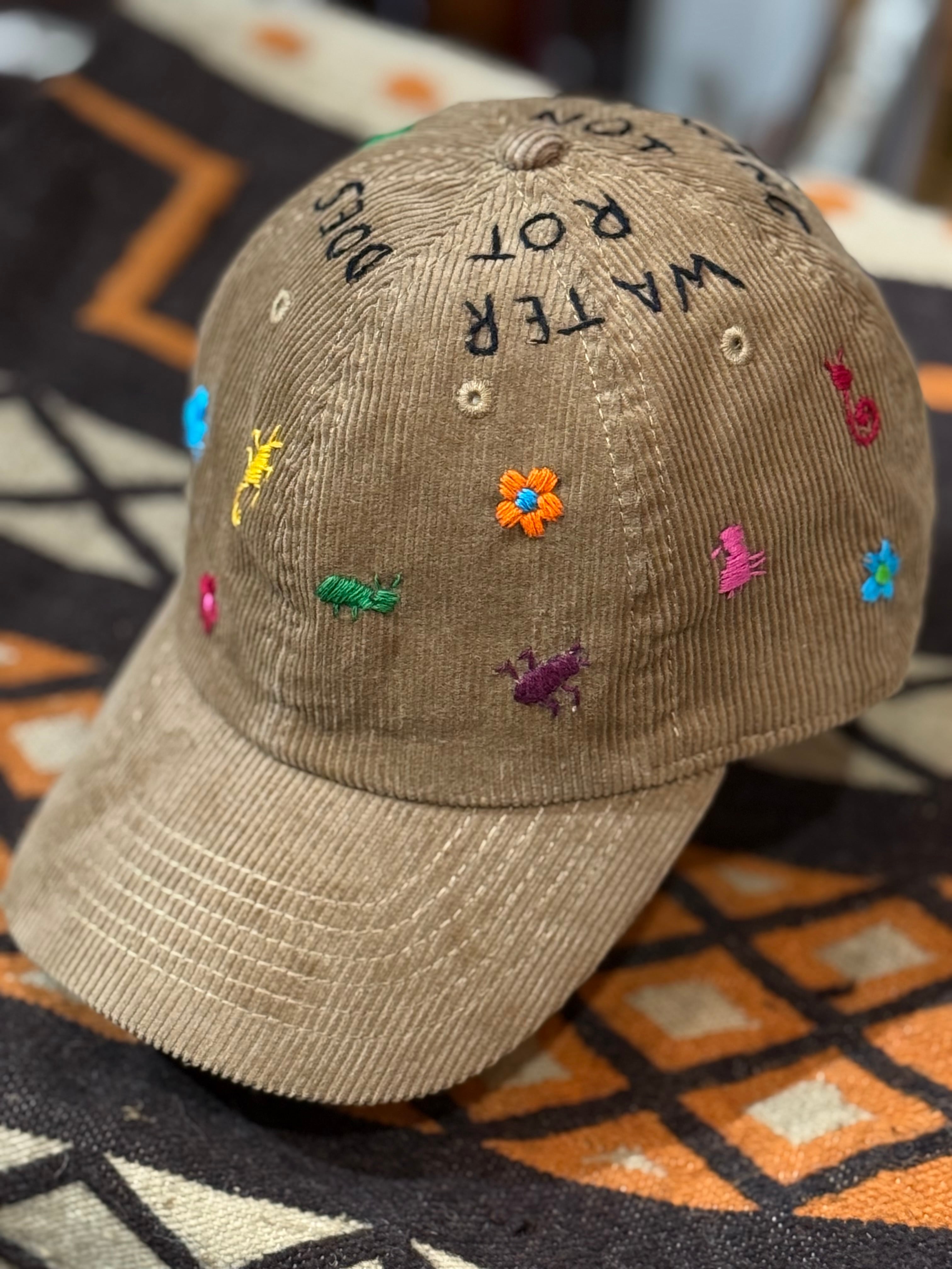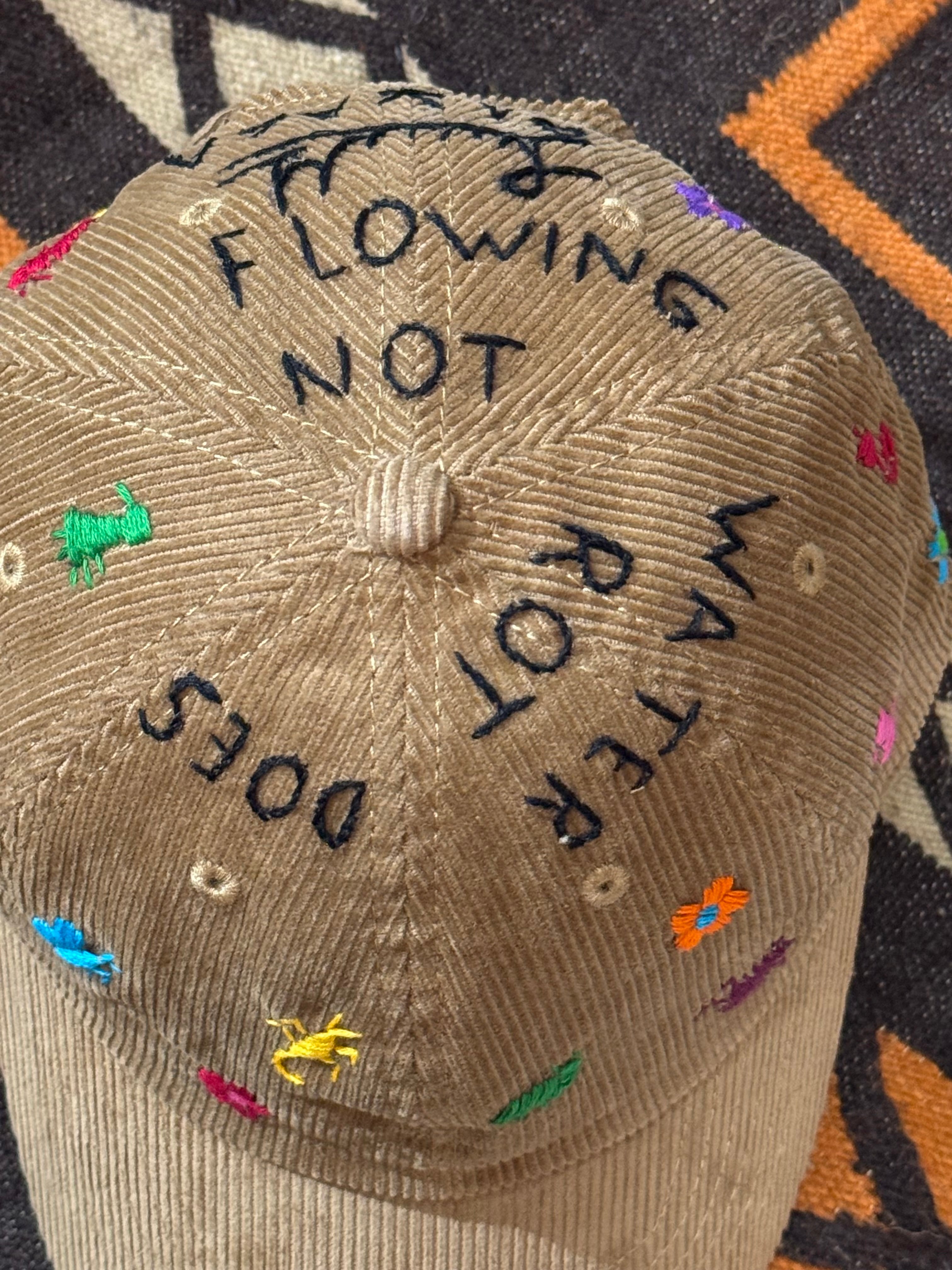 生き物や花などのモチーフに加え、FLOWING WATER DOES NOT ROT(流れる水は澱まない/流されないように流れていく)のメッセージ入り。