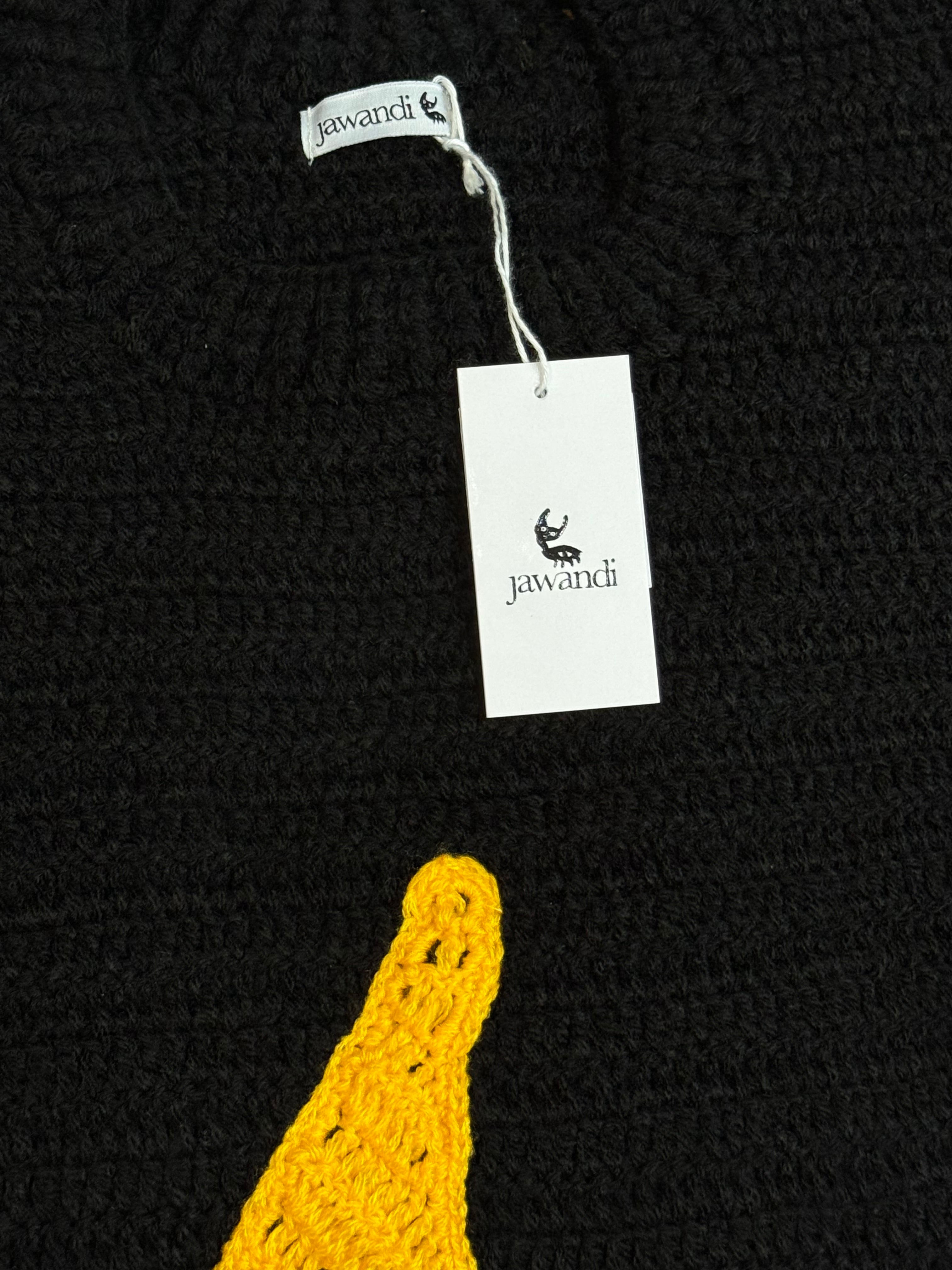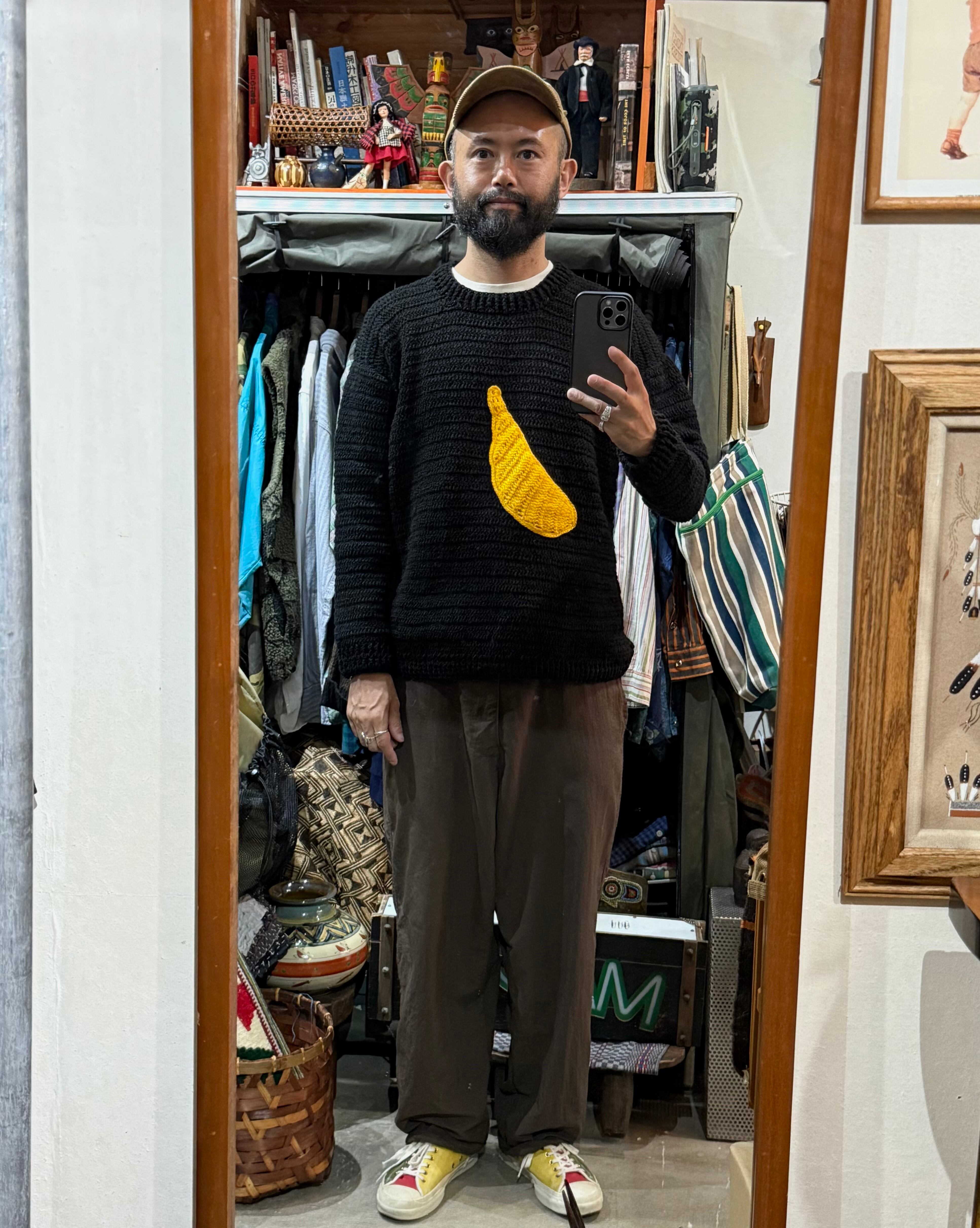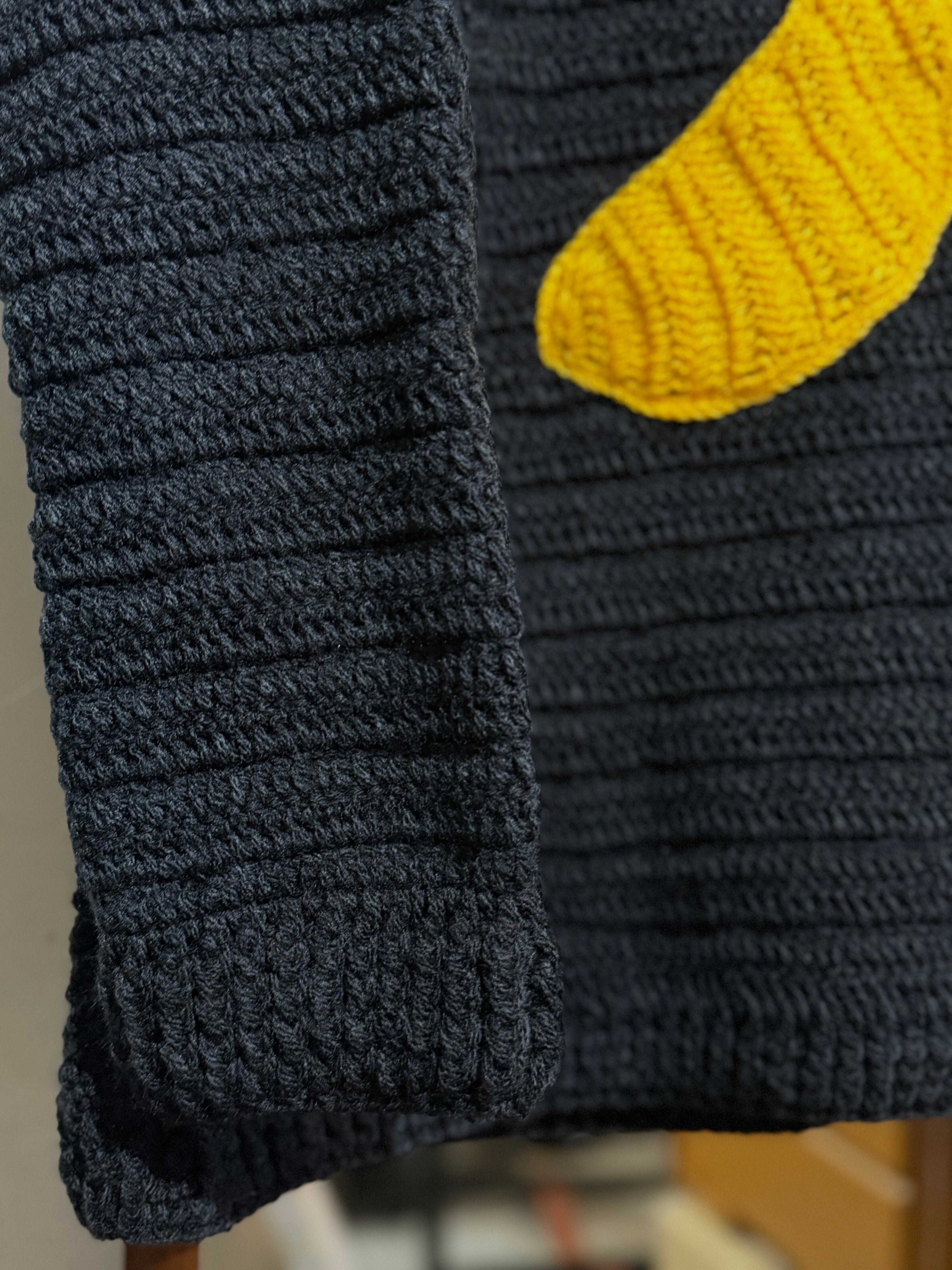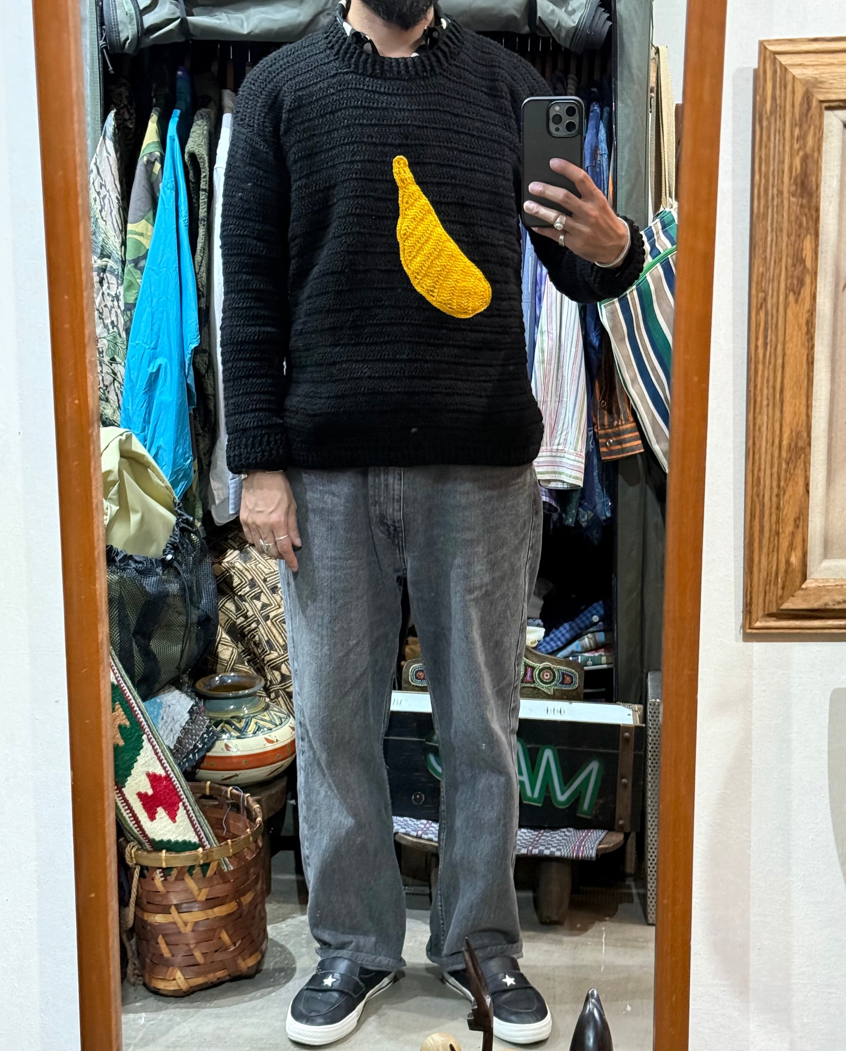 シンプルながらも編み地に表情のあるブラックベースのクルーネックボディに、インパクトのあるバナナ柄の編み地が縫い付けられています。