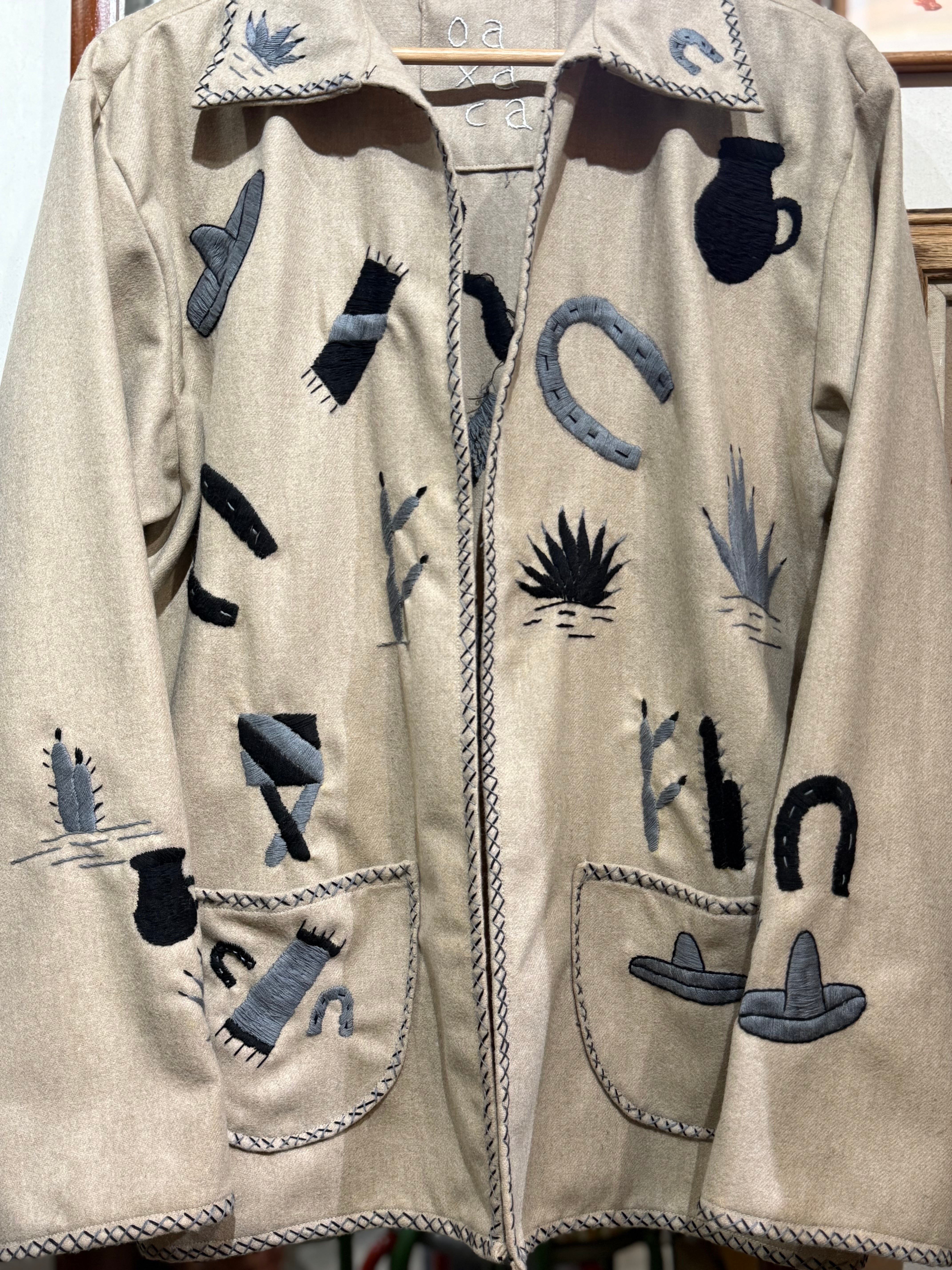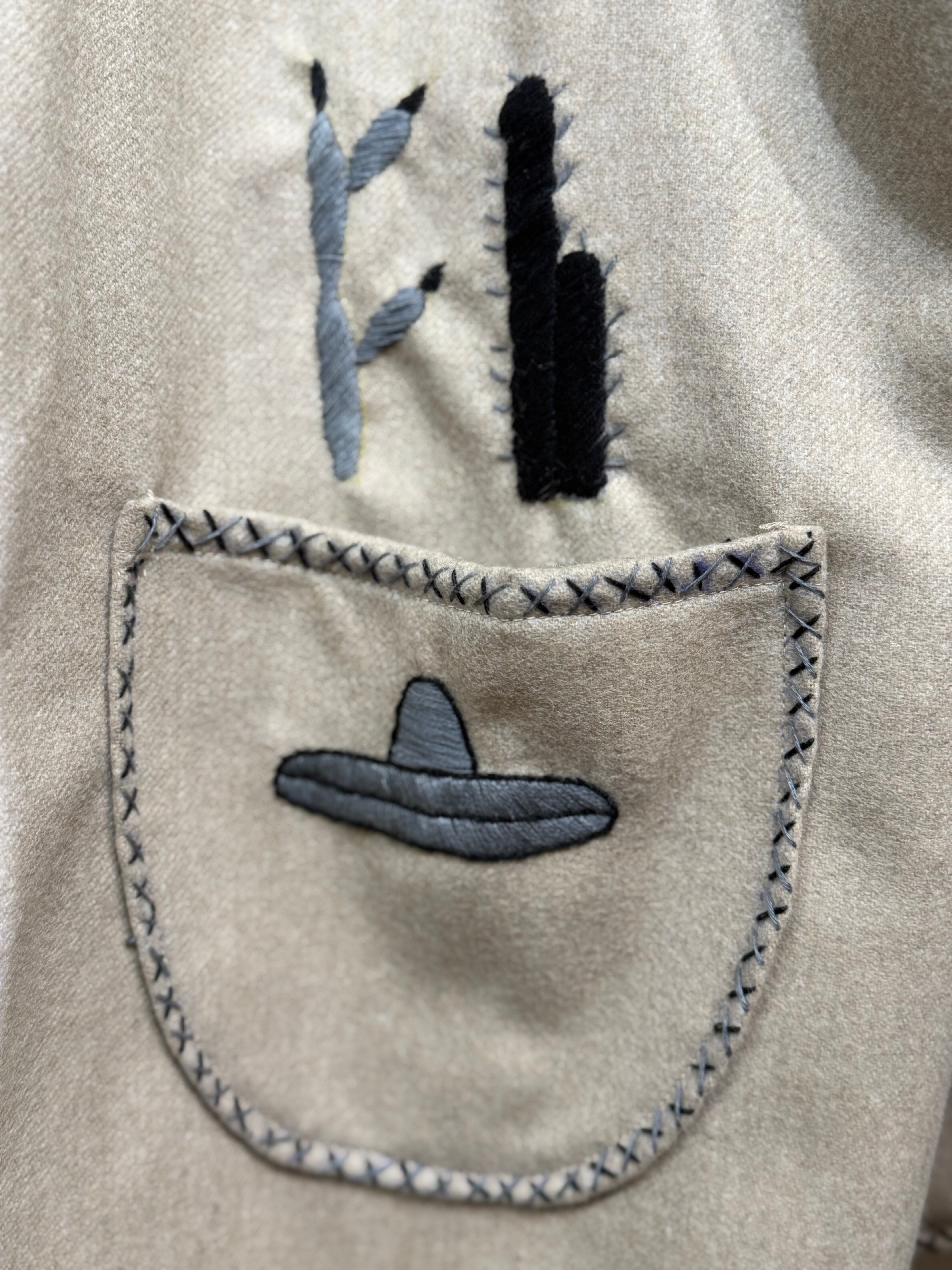 刺繍のモチーフはサボテンやアガベ(テキーラの原料)やメキシカンハット、陶器、馬の馬蹄などメキシコやオアハカに由来するモノが2トーンの刺繍で丁寧に施されています。