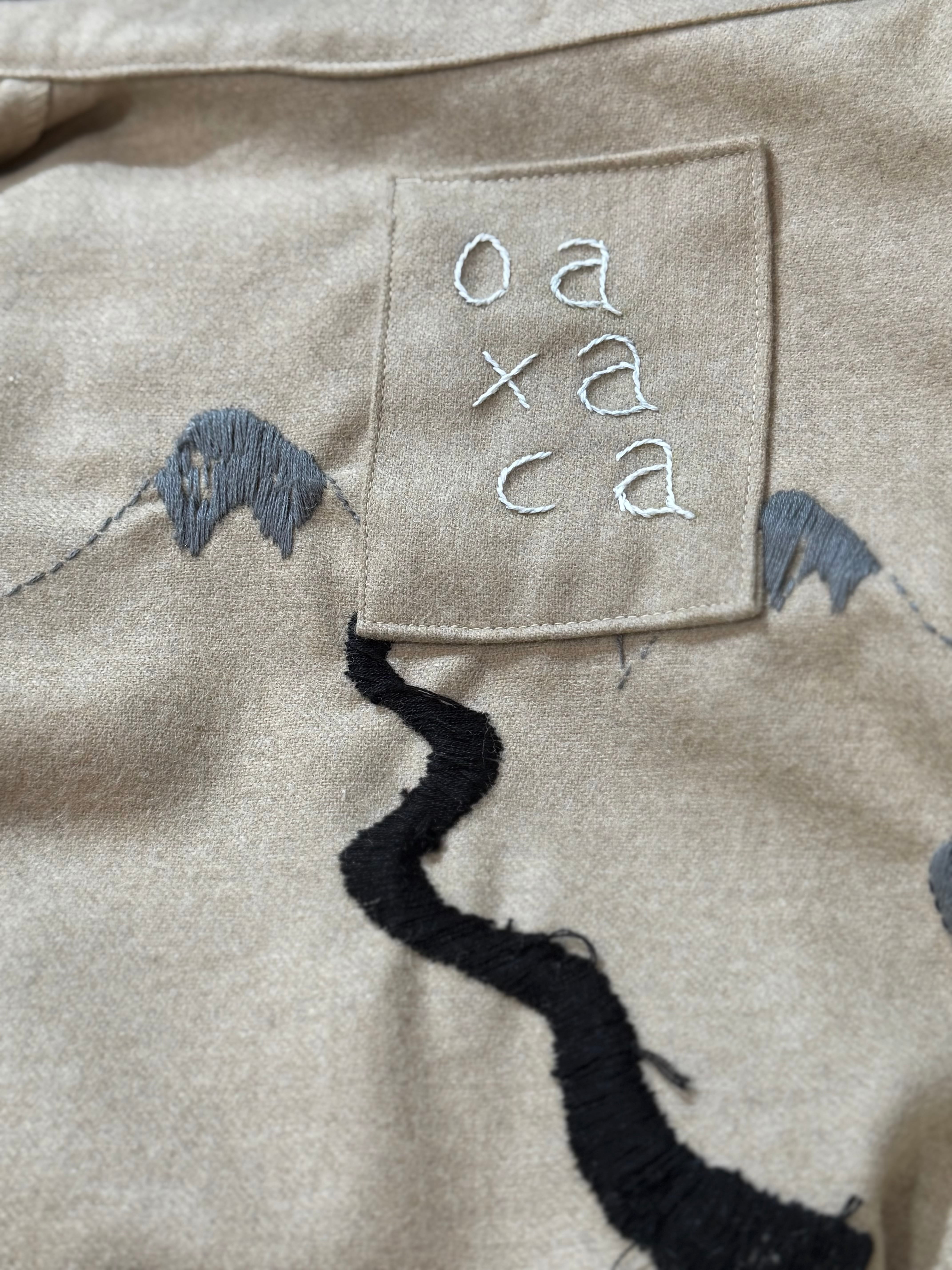 ボディは日本の尾州産のウールフランネル(ウール90%、ナイロン10%)をボタンのない羽織り仕様で日本で仕立て、メキシコのオアハカで手刺繍により装飾されています。