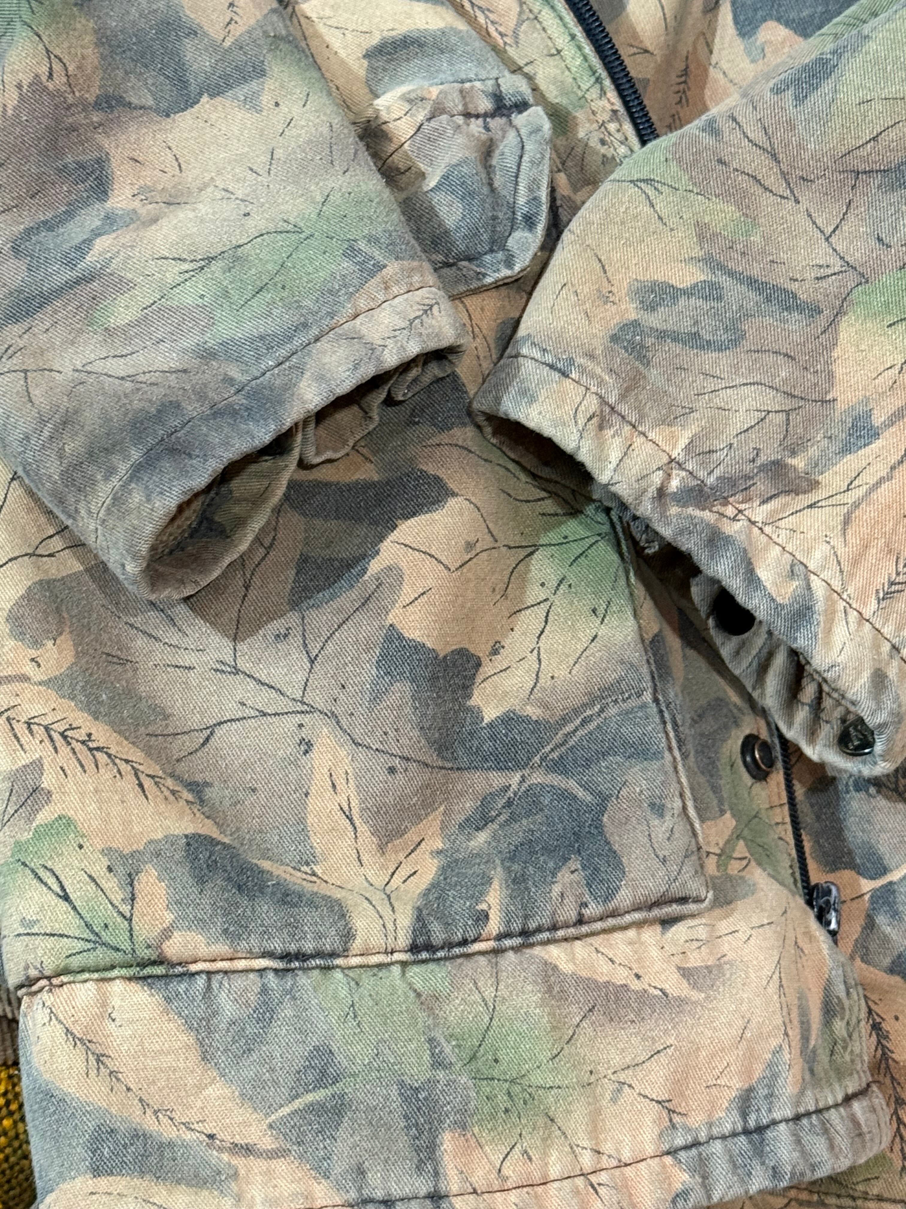 アウトドア、ハンティング系のコットン地古着アウターならではなユーズド感が全体的に有。