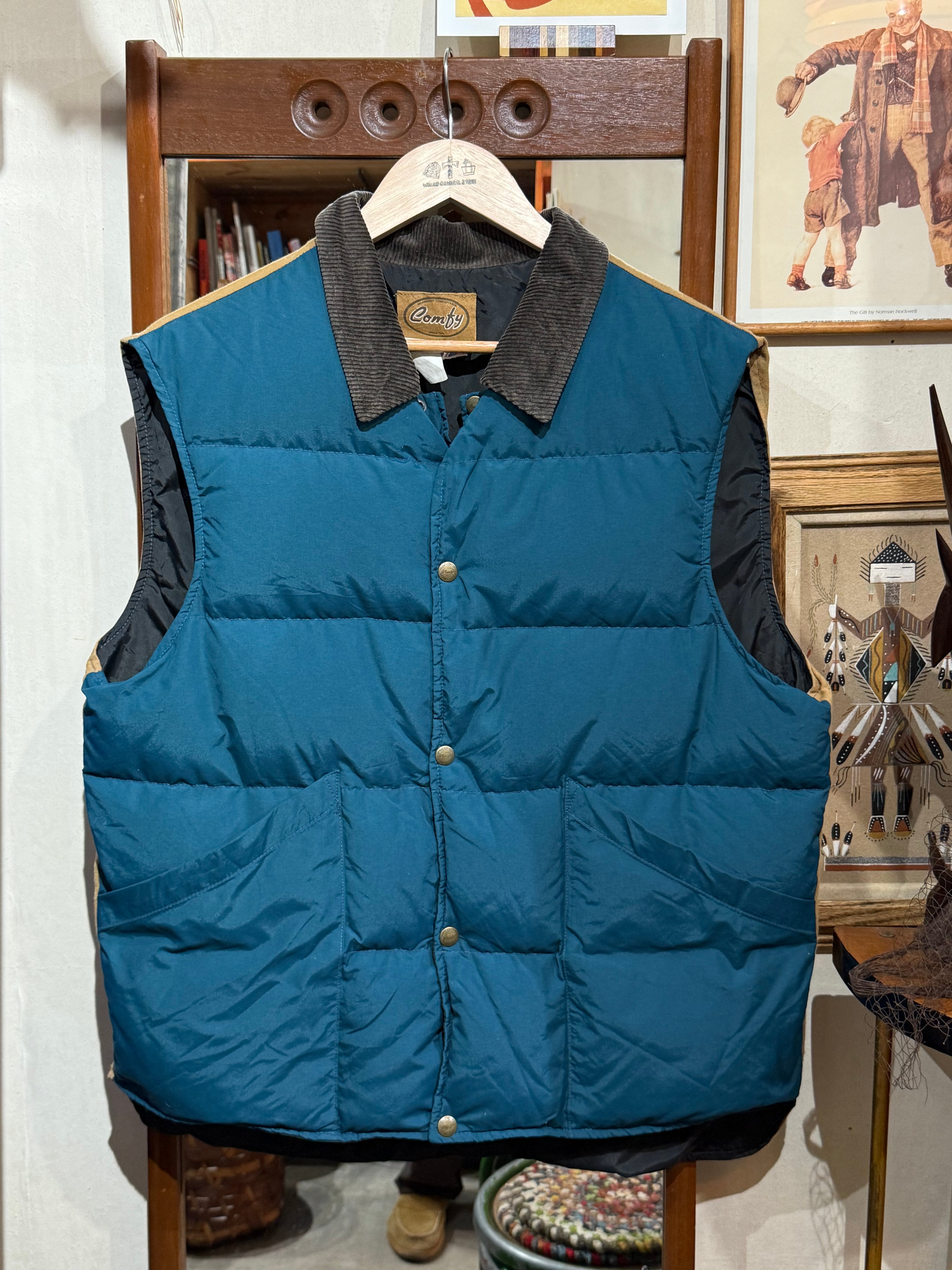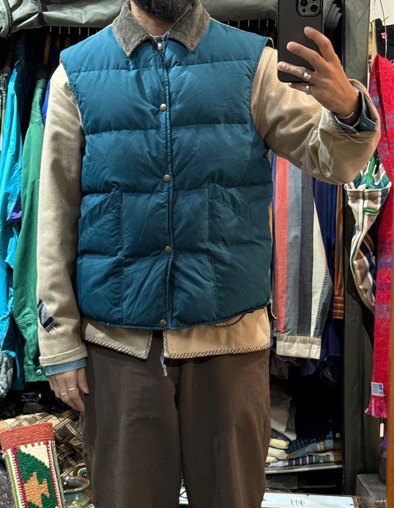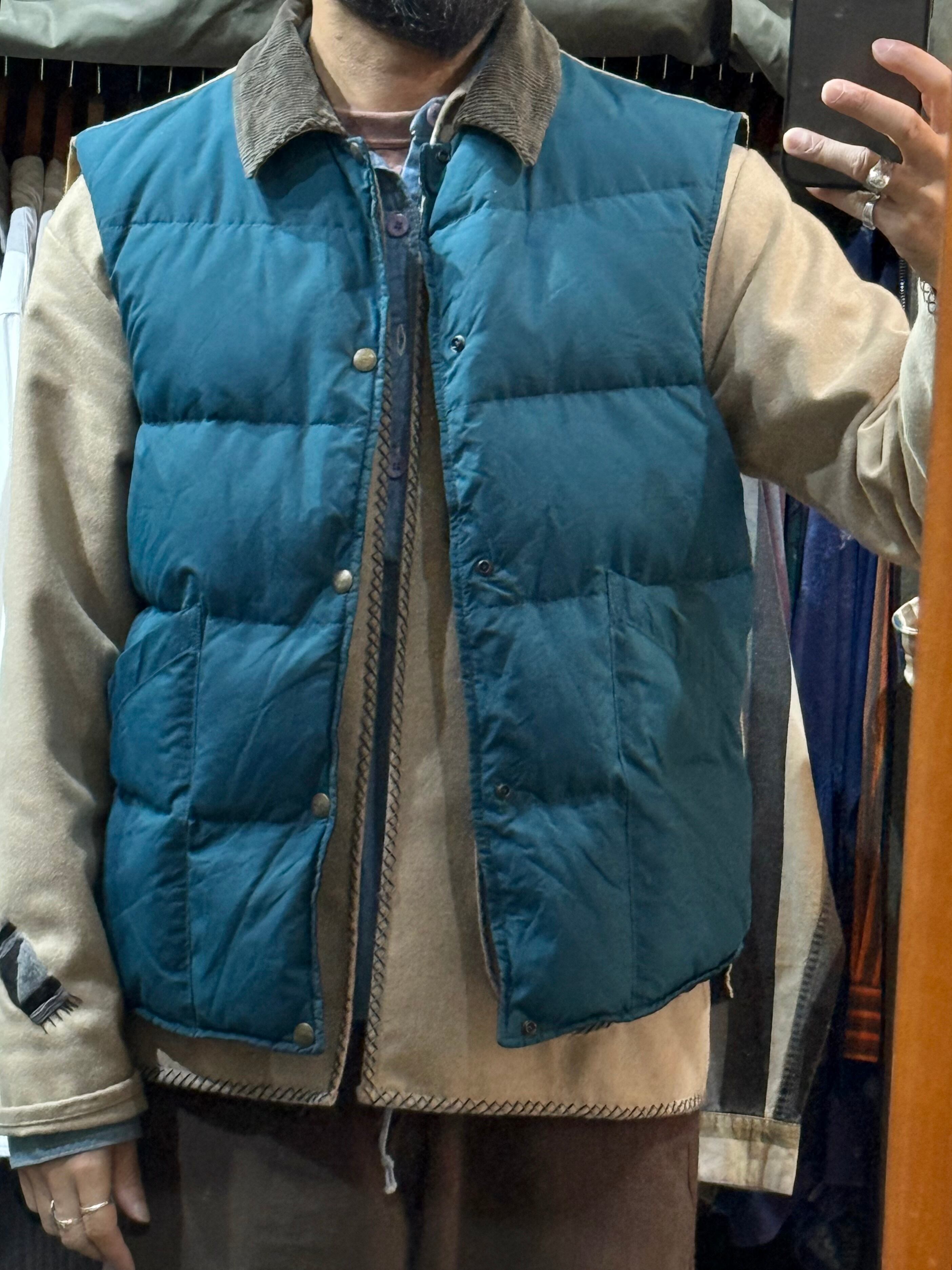 エリがコーデュロイ、後ろ見頃はキャンバス地という生地のコンビネーションが面白いダウンベスト。
