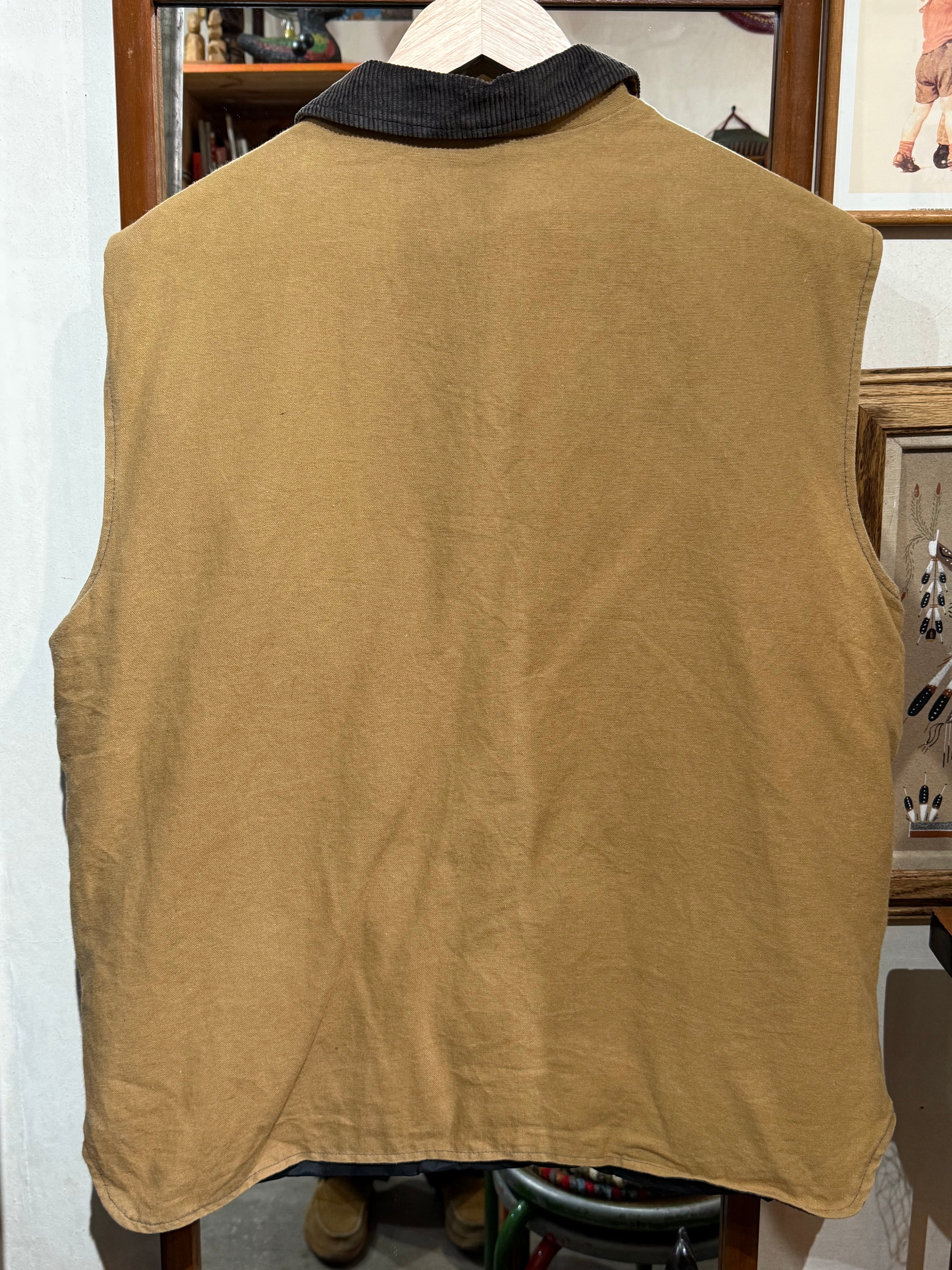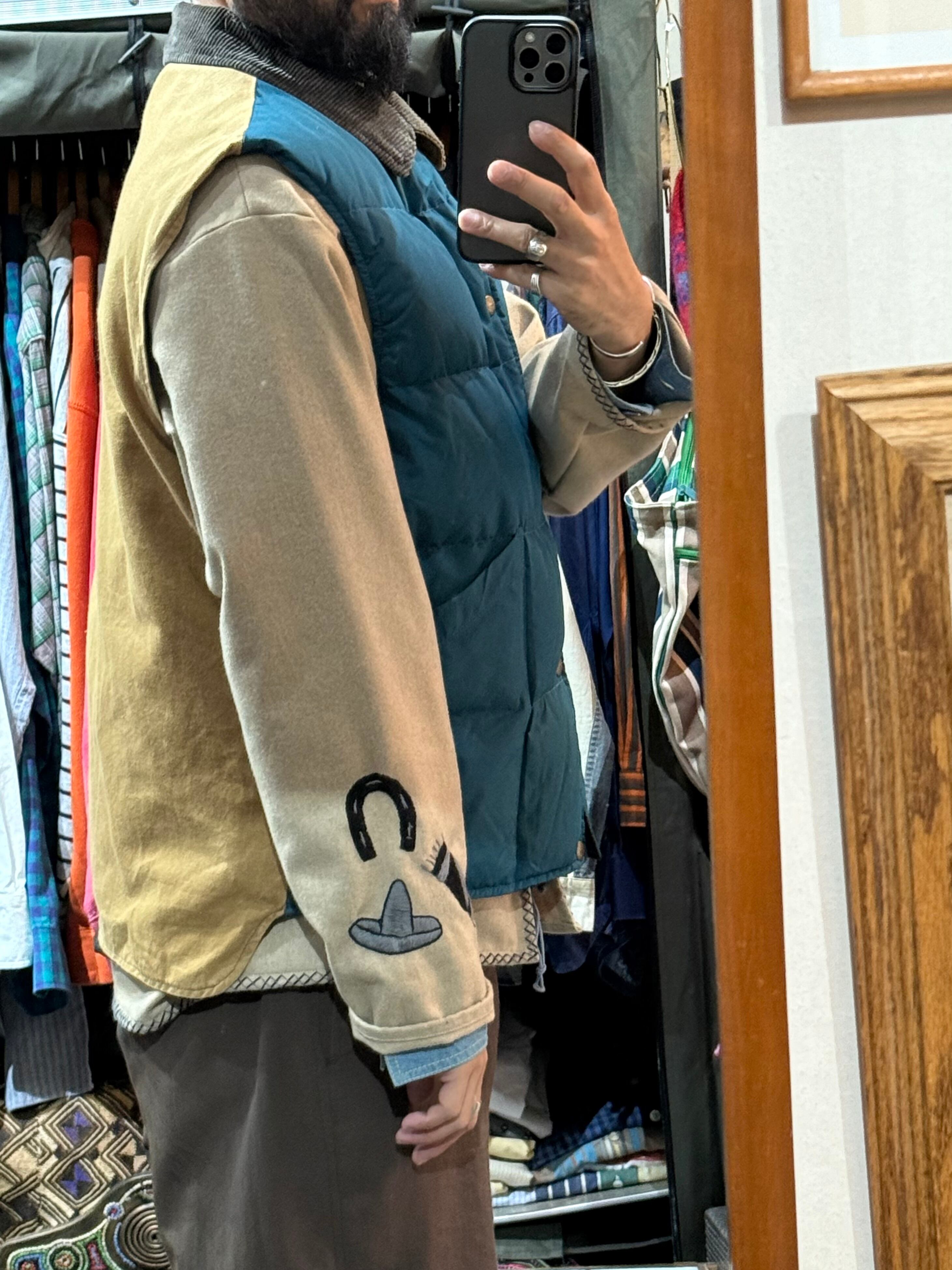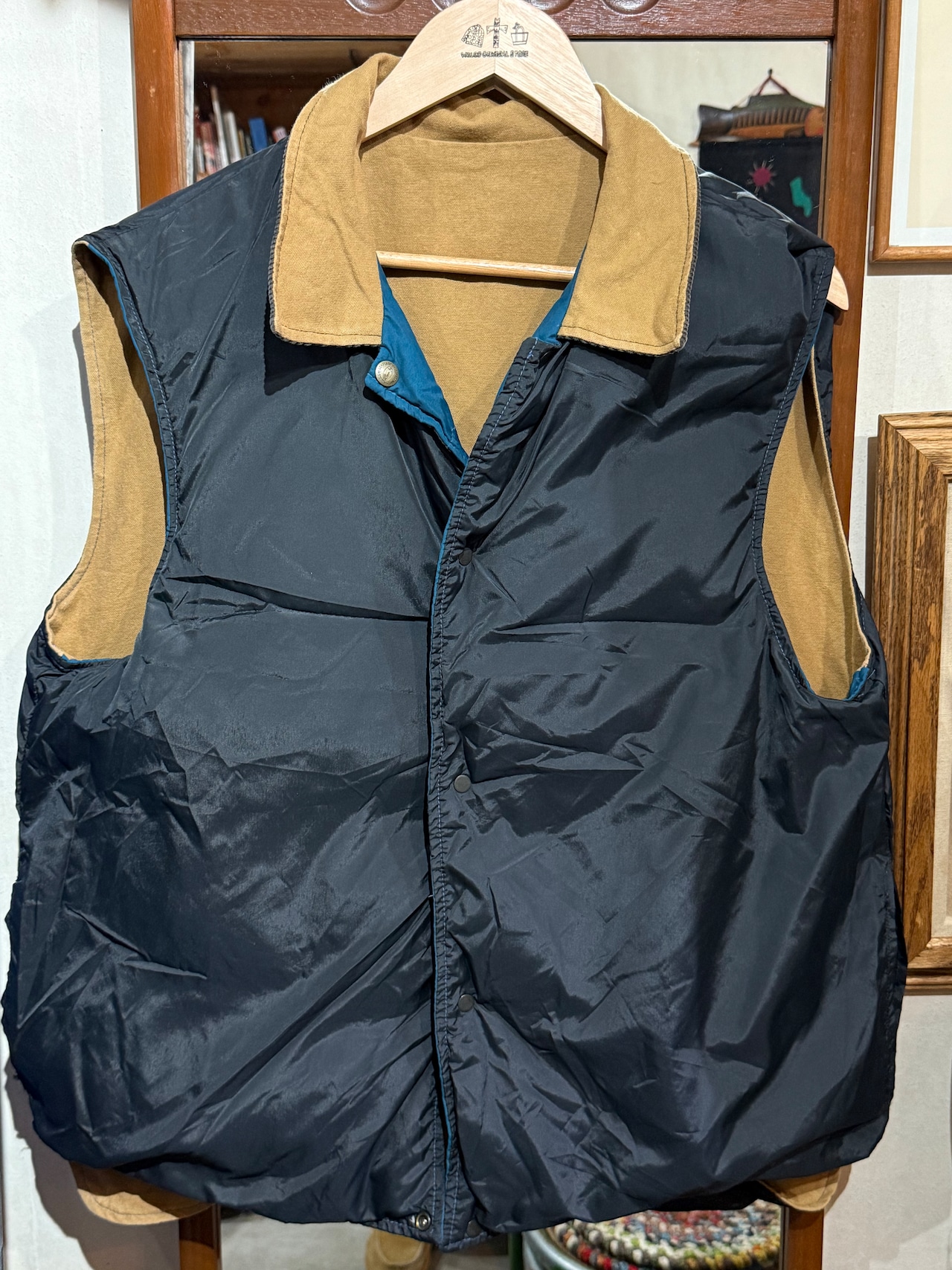 エリがコーデュロイ、後ろ見頃はキャンバス地という生地のコンビネーションが面白いダウンベスト。