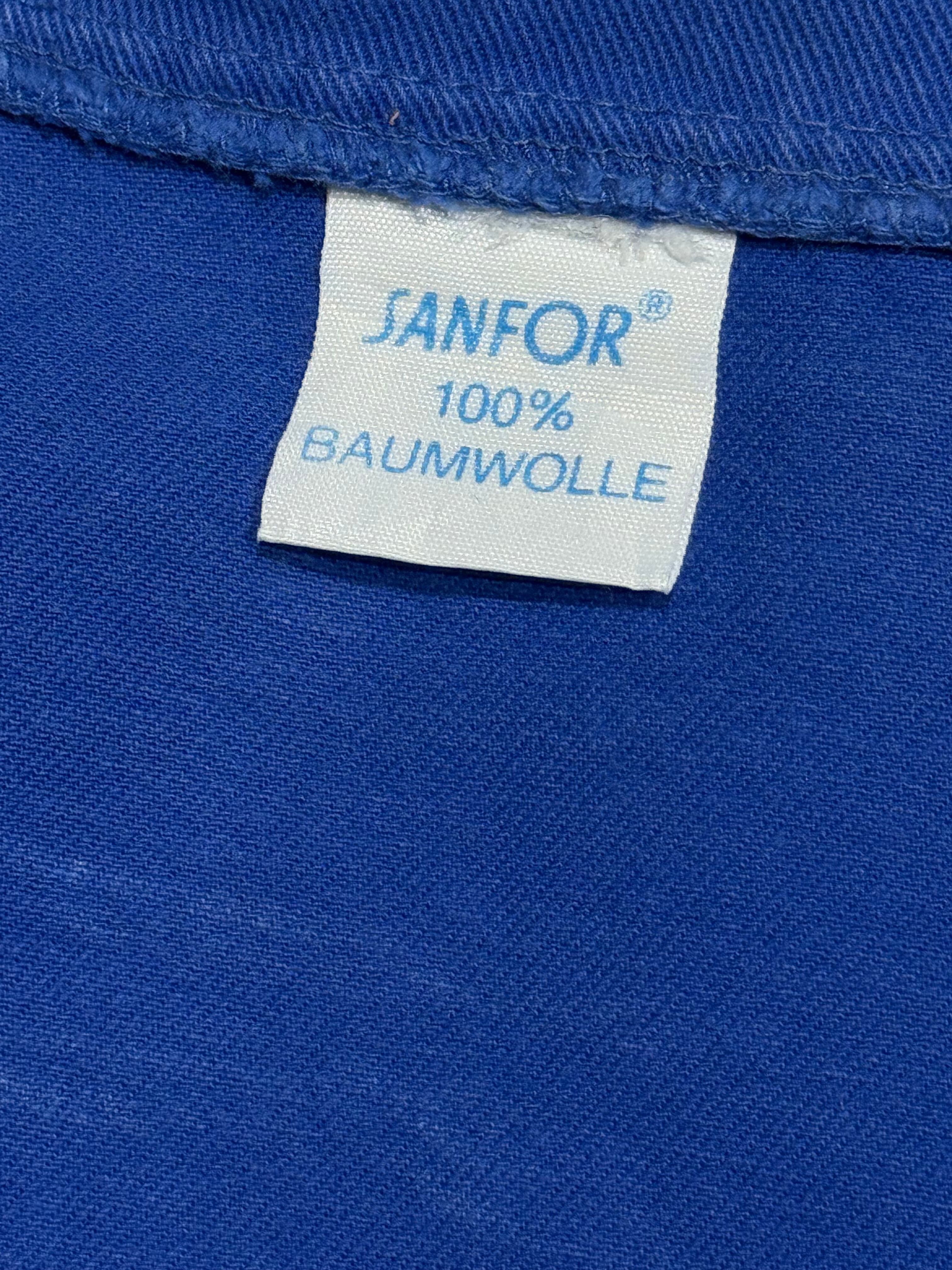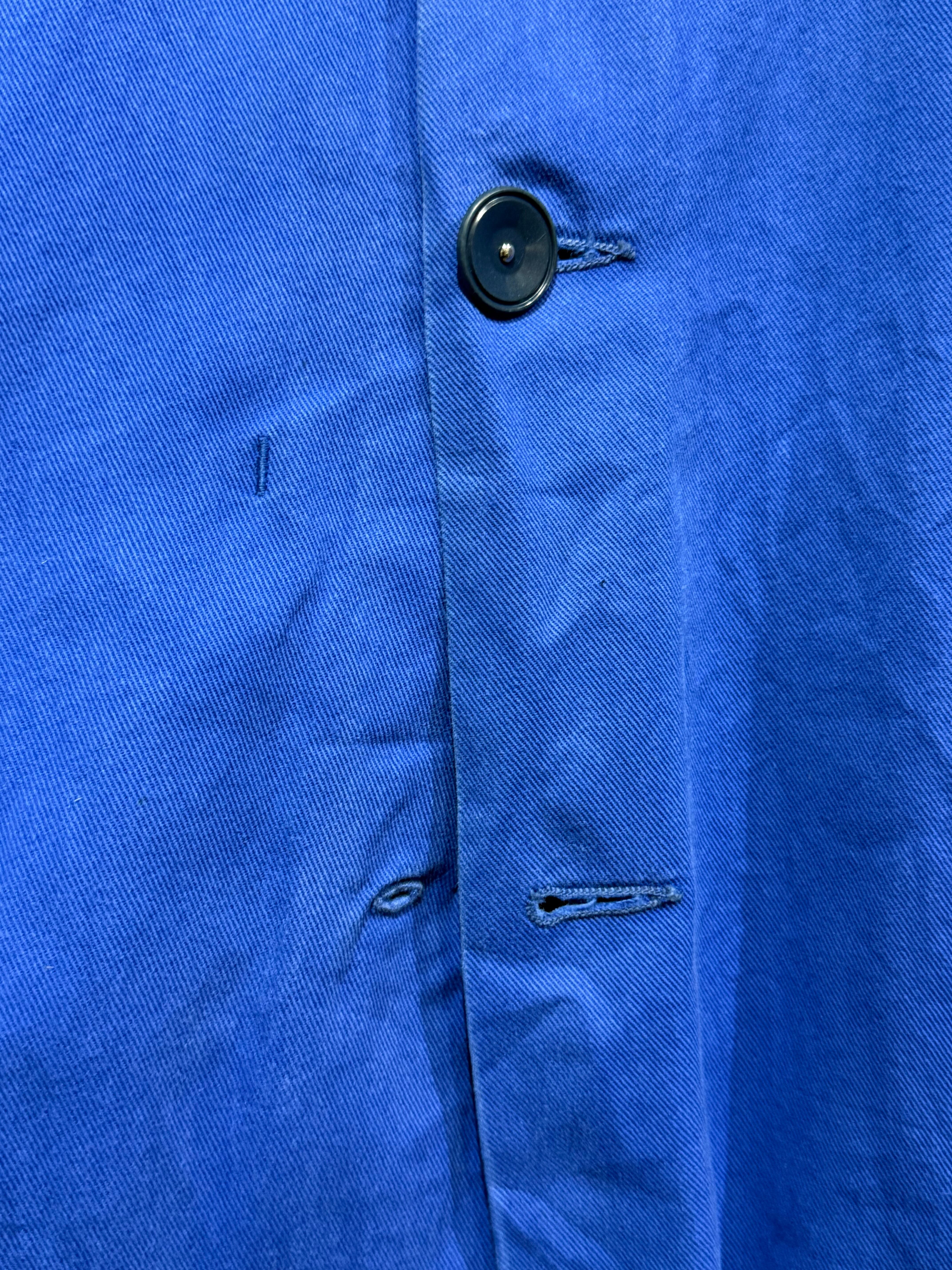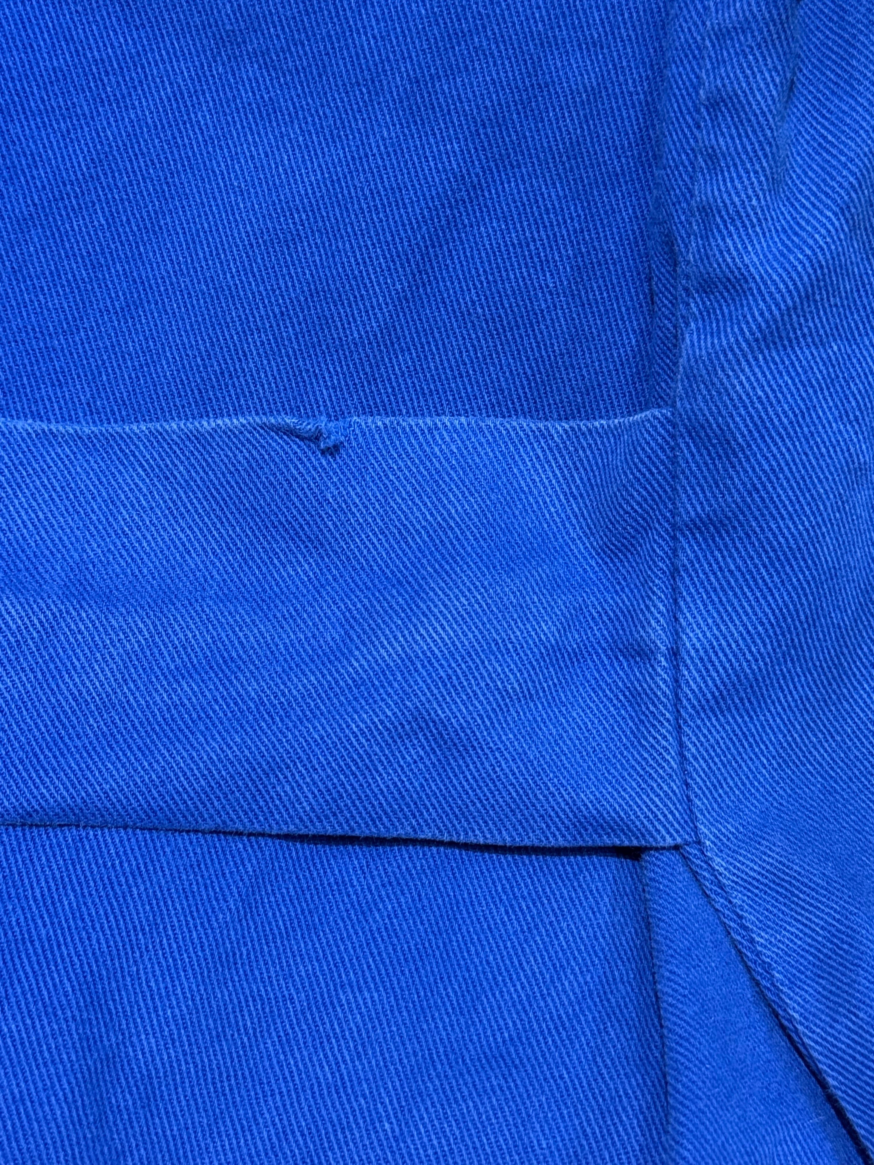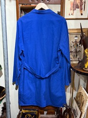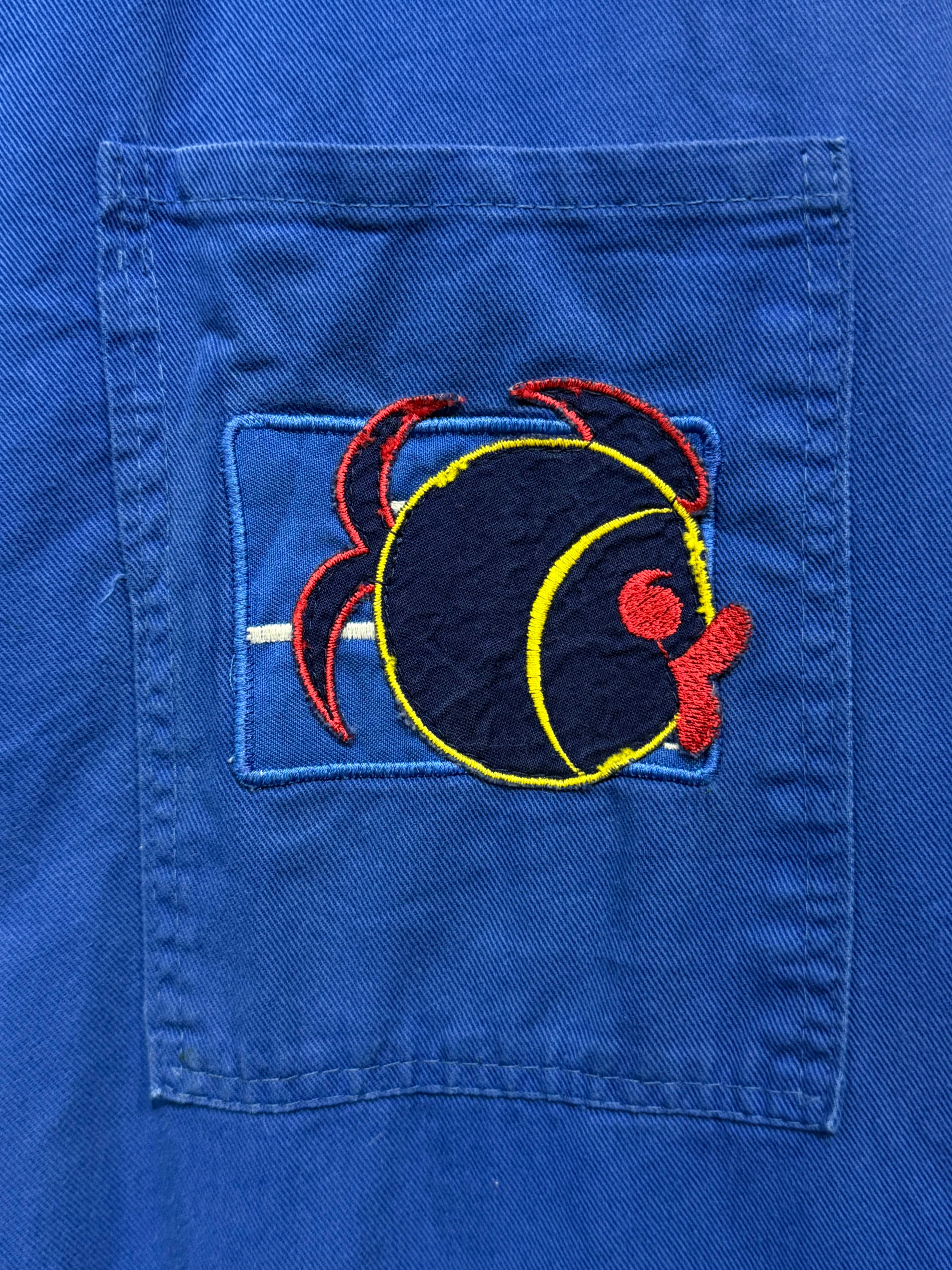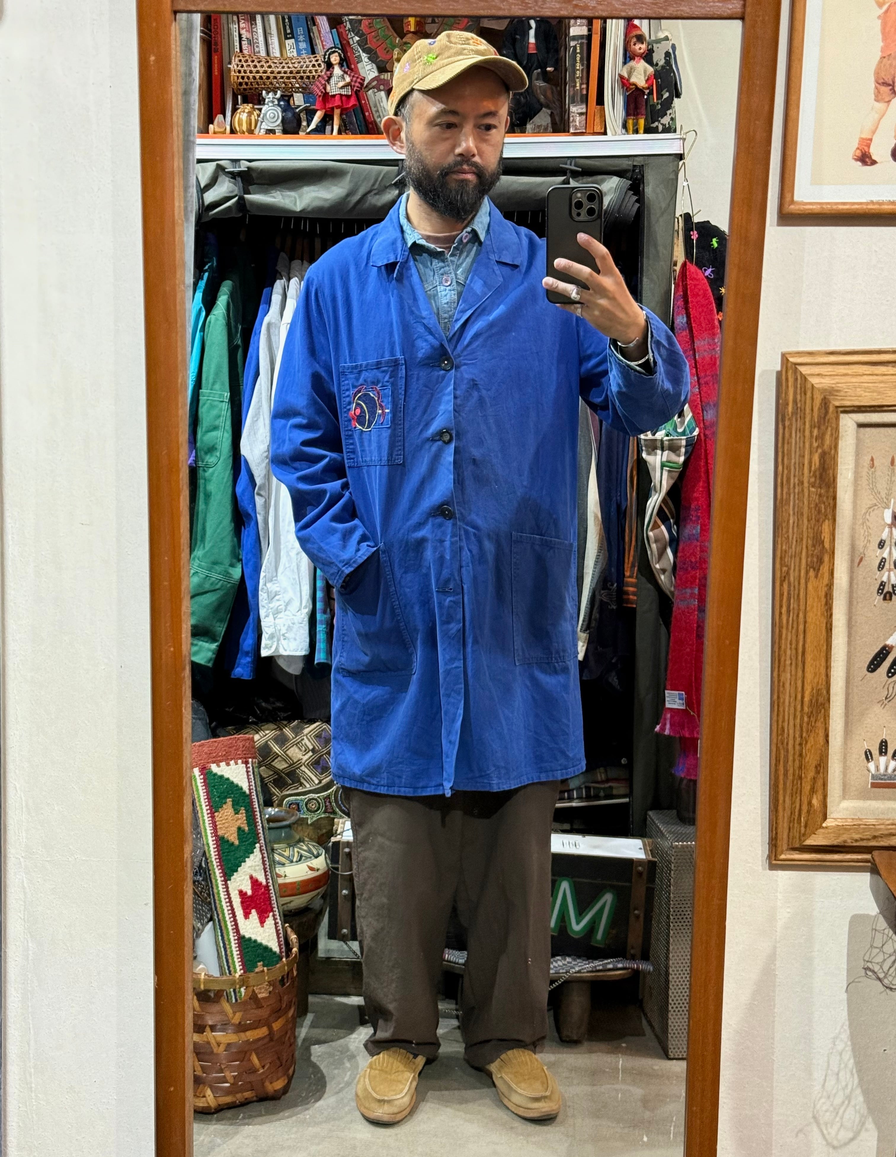 ユーロワークジャケットやコートによく見られる落ち着いたロイヤルブルーな色合いのモデルですが、胸ポケットの謎の魚ワッペンがポイント