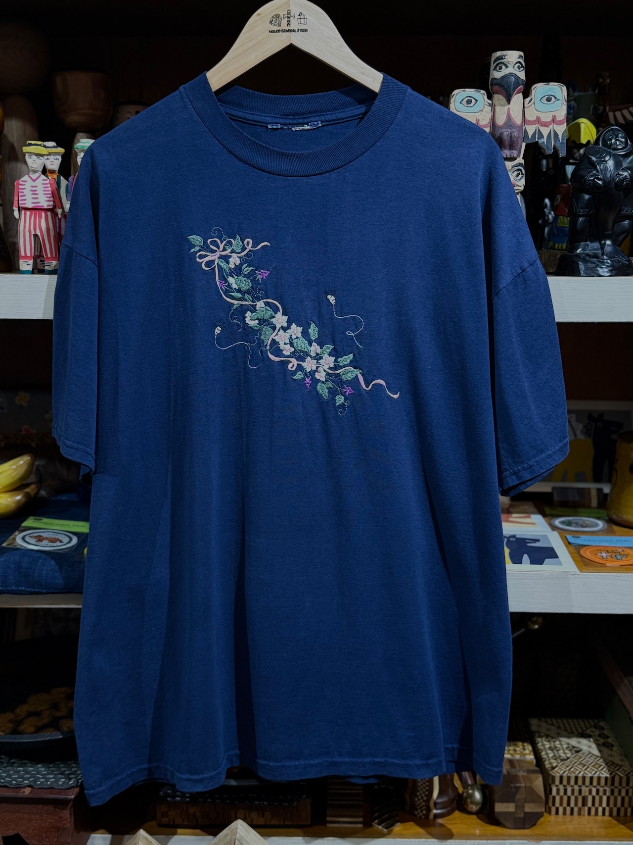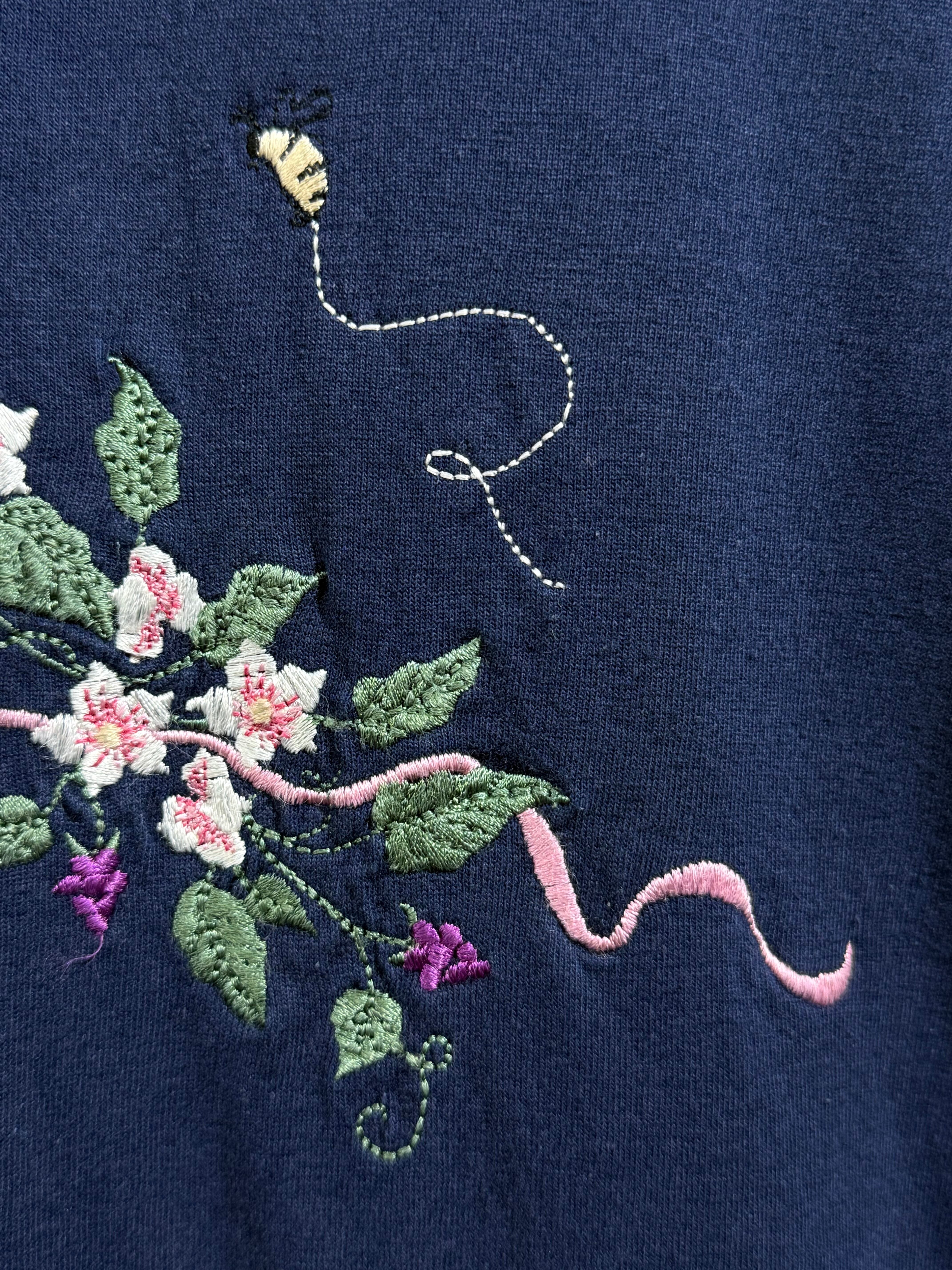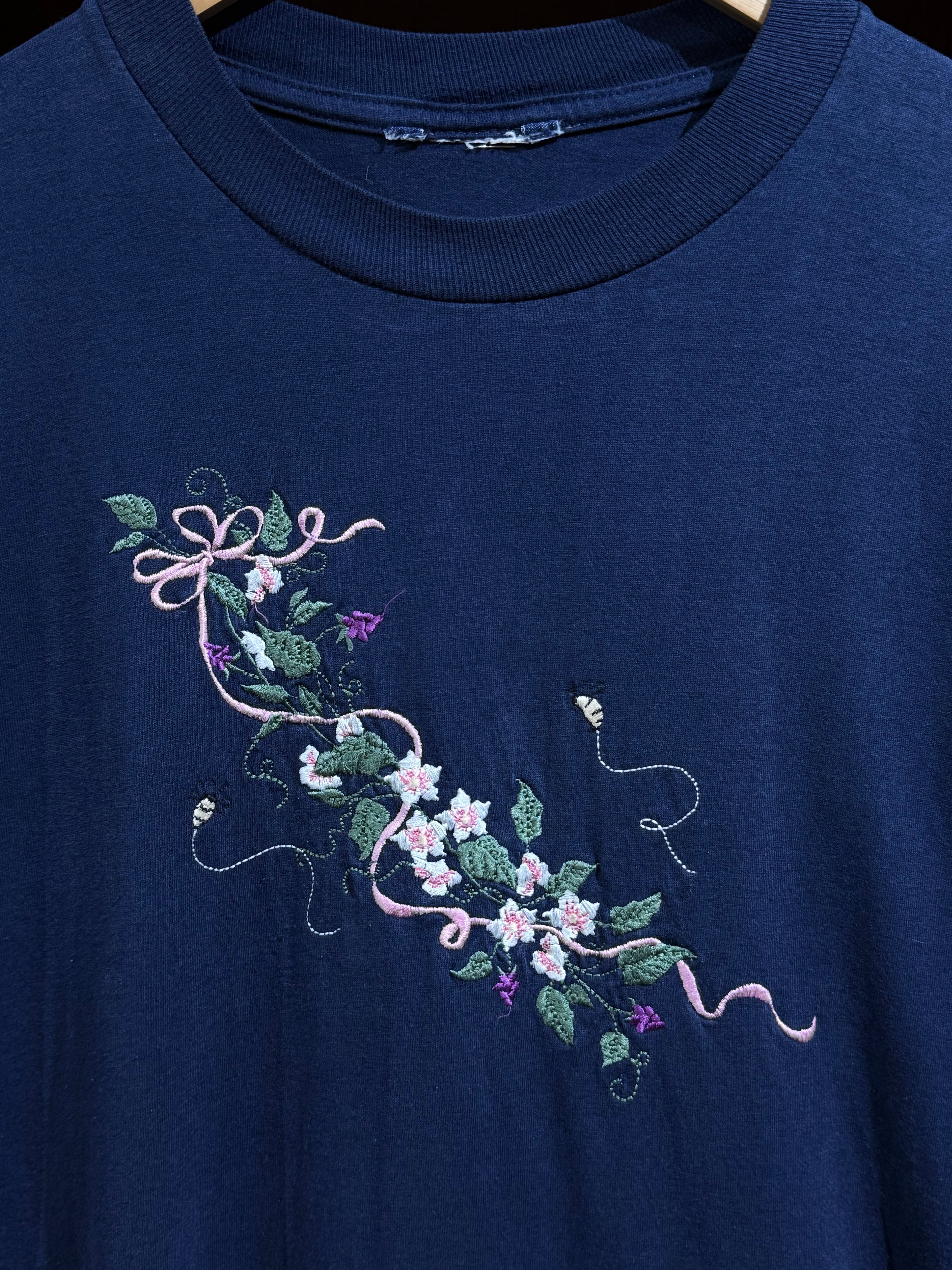 ネイビー地に、花と蜂?が刺繍されたOLD Tシャツ