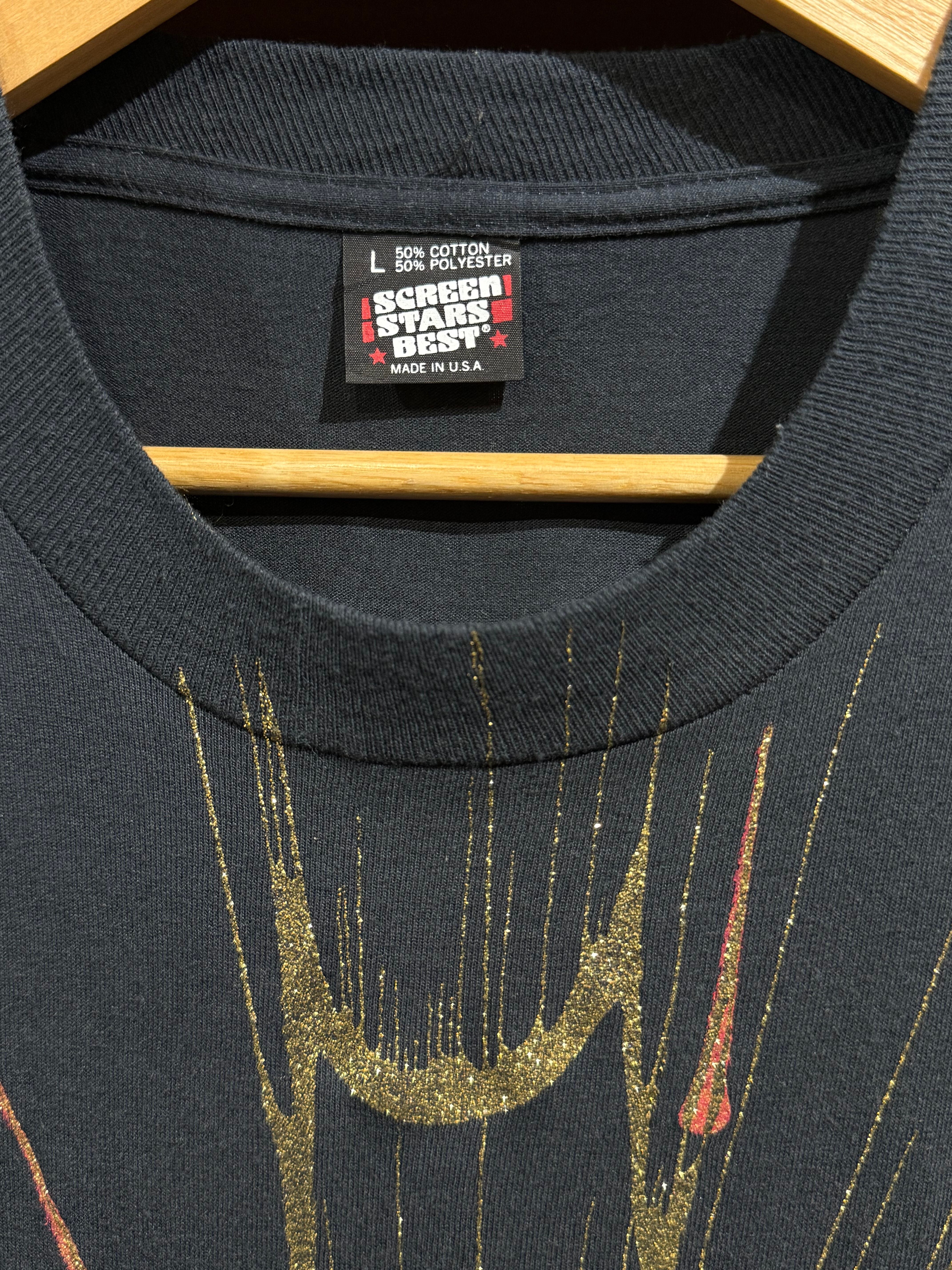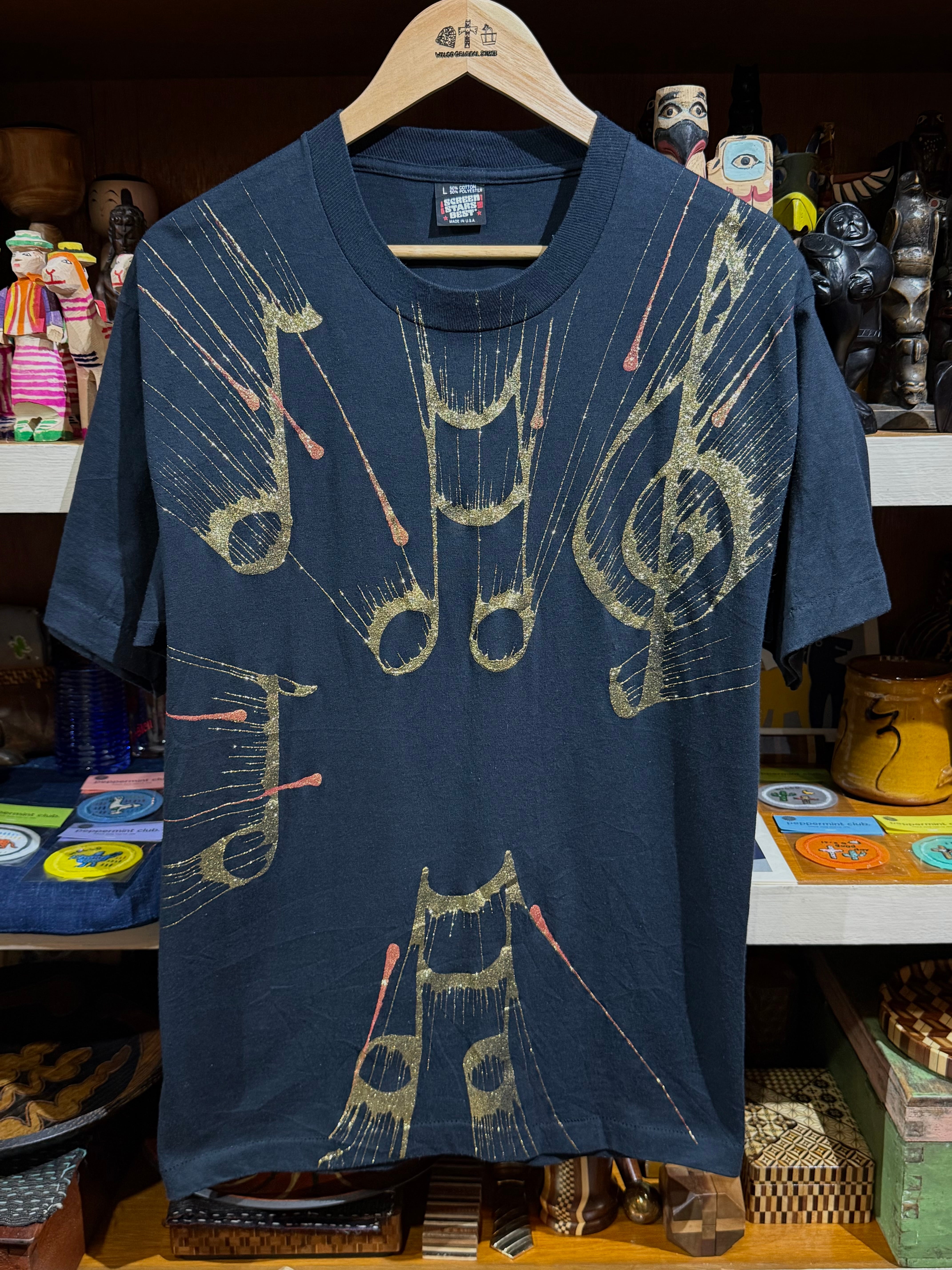 ブラックボディに、躍動感のあるメタリックな音符プリントが映えるOLD Tシャツです。