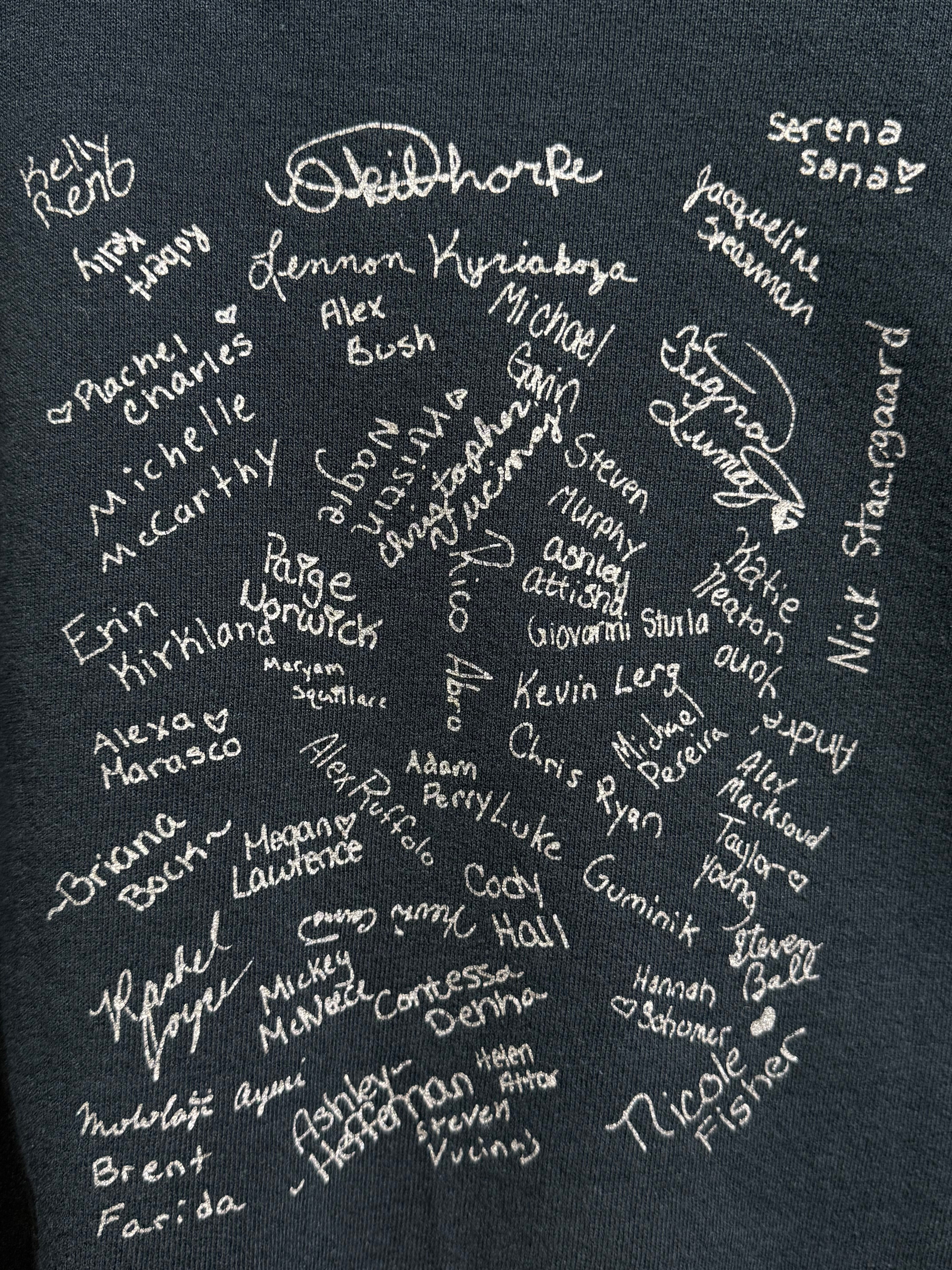 スミクロが全体的にフェードしたような良い感じのボディ(比較の為、8カット目に新品のブラックと並べています。)に、ブルーの刺繍と背面の寄せ書きが映えます。