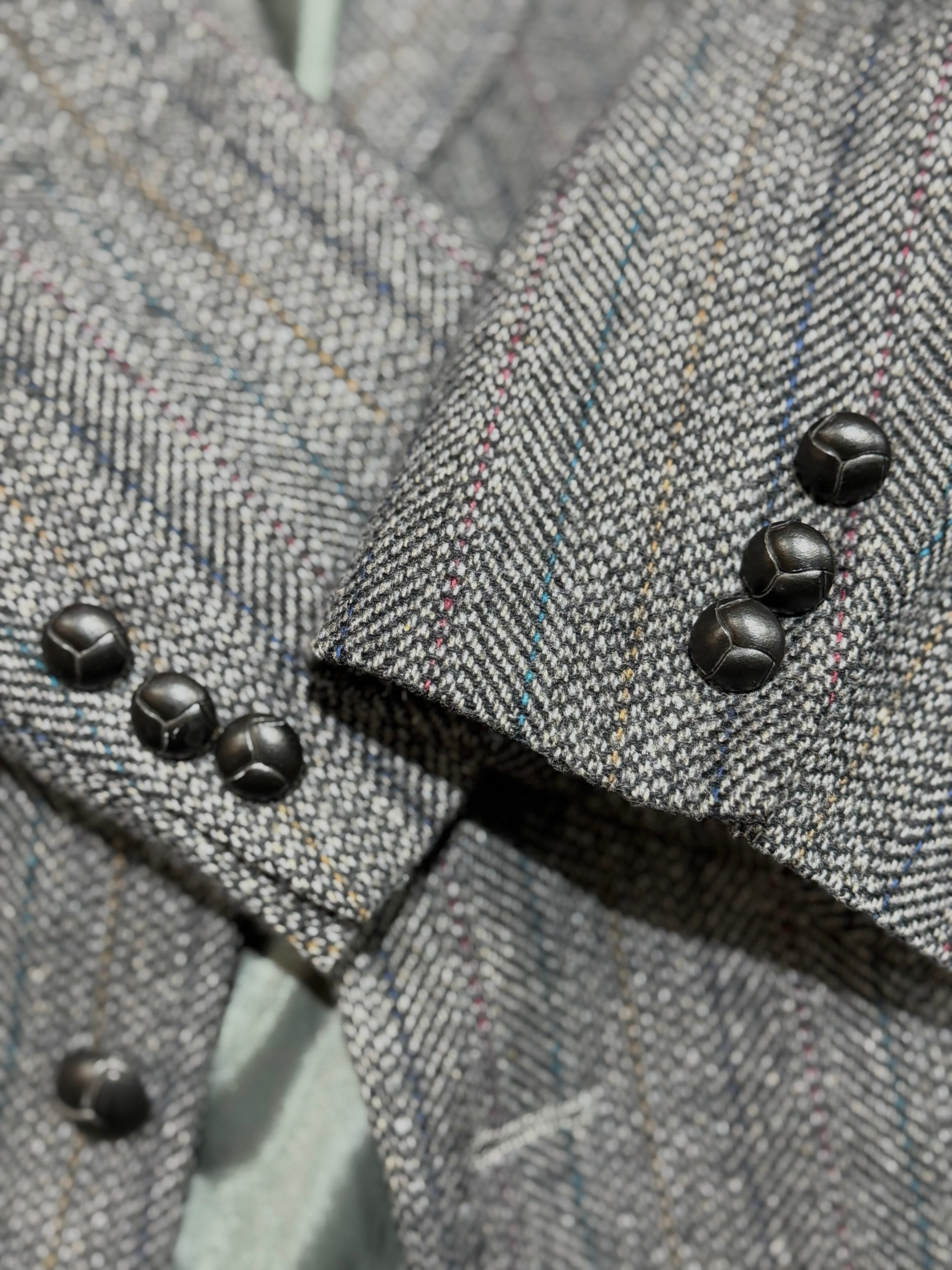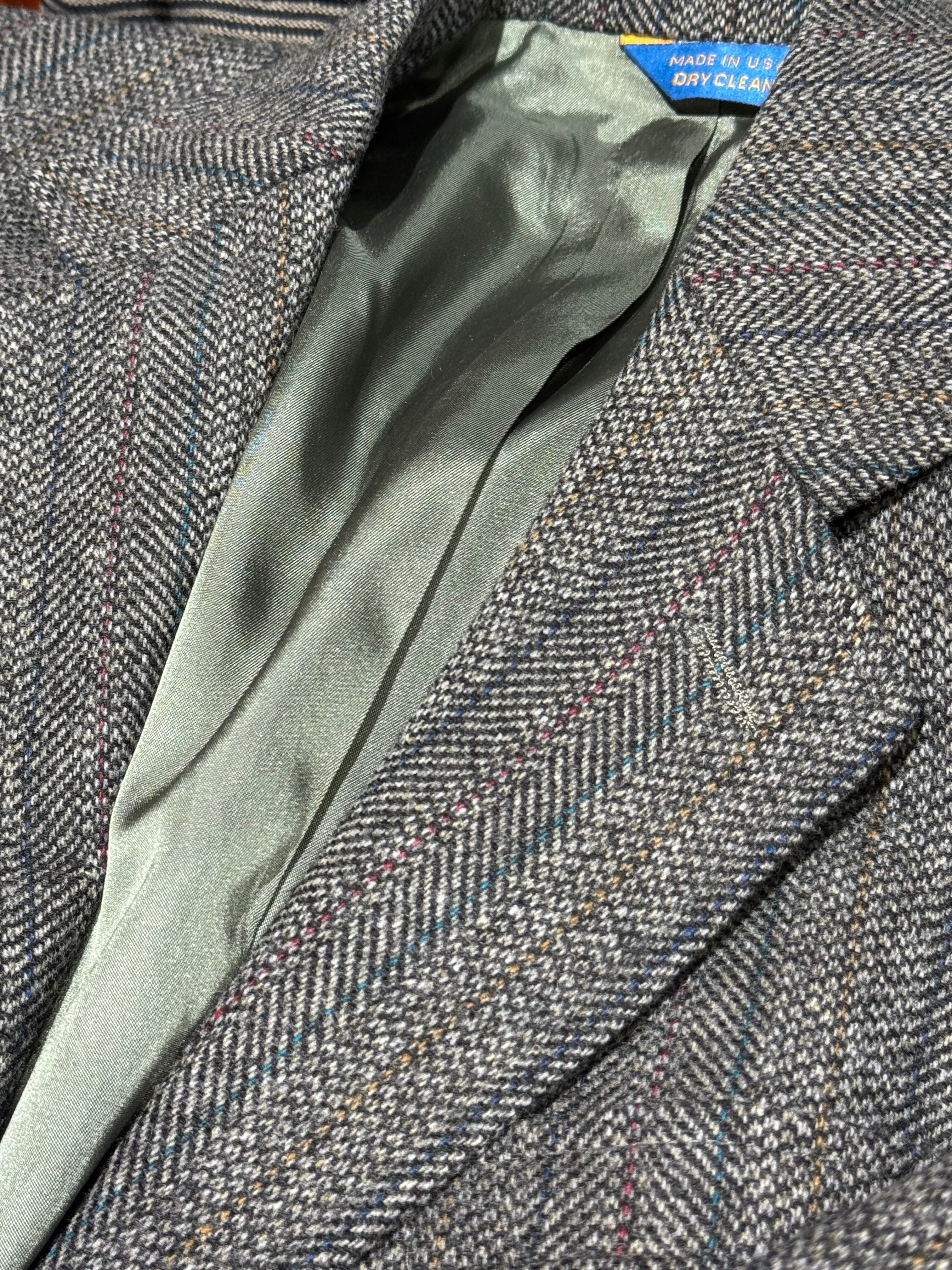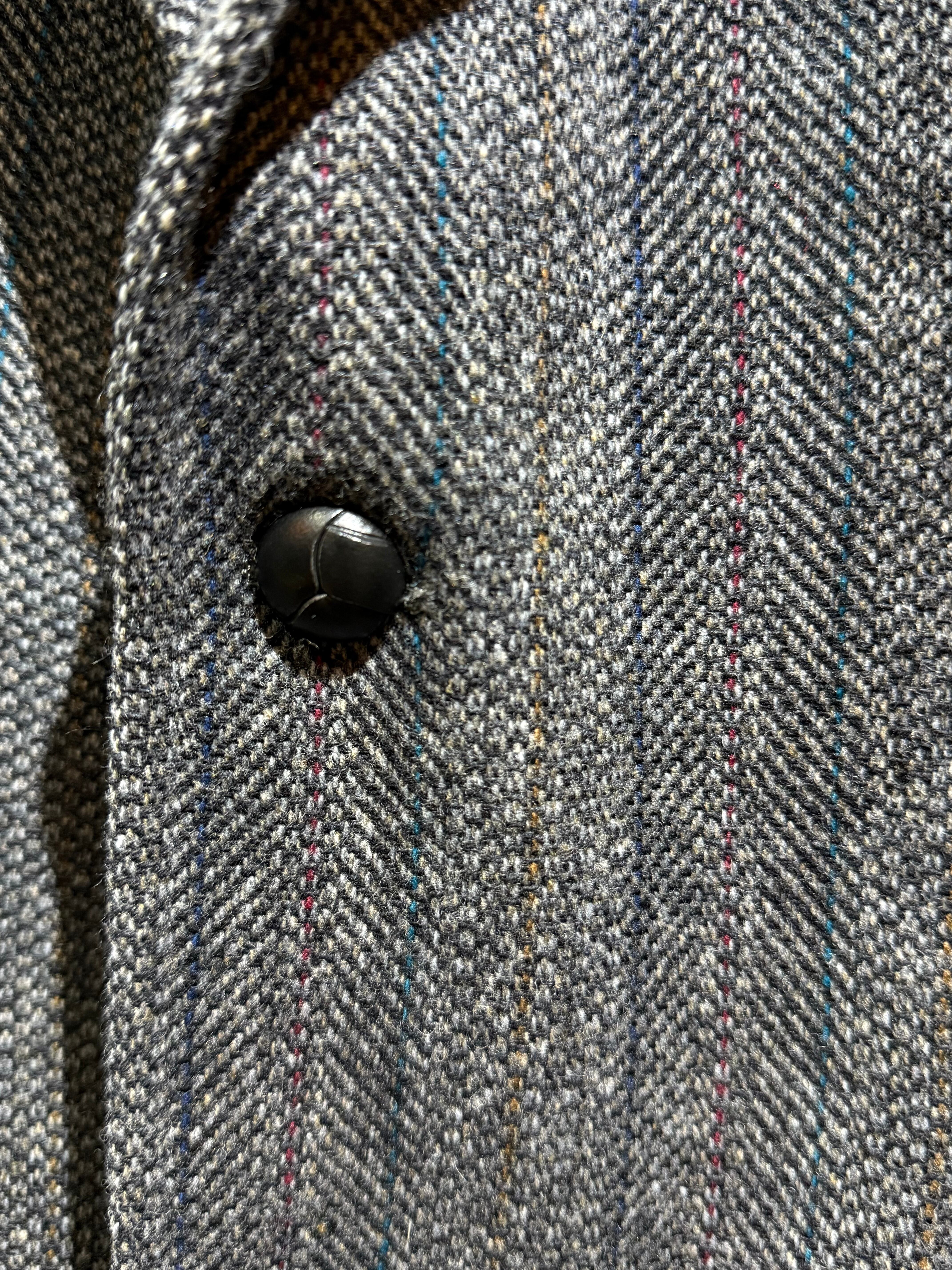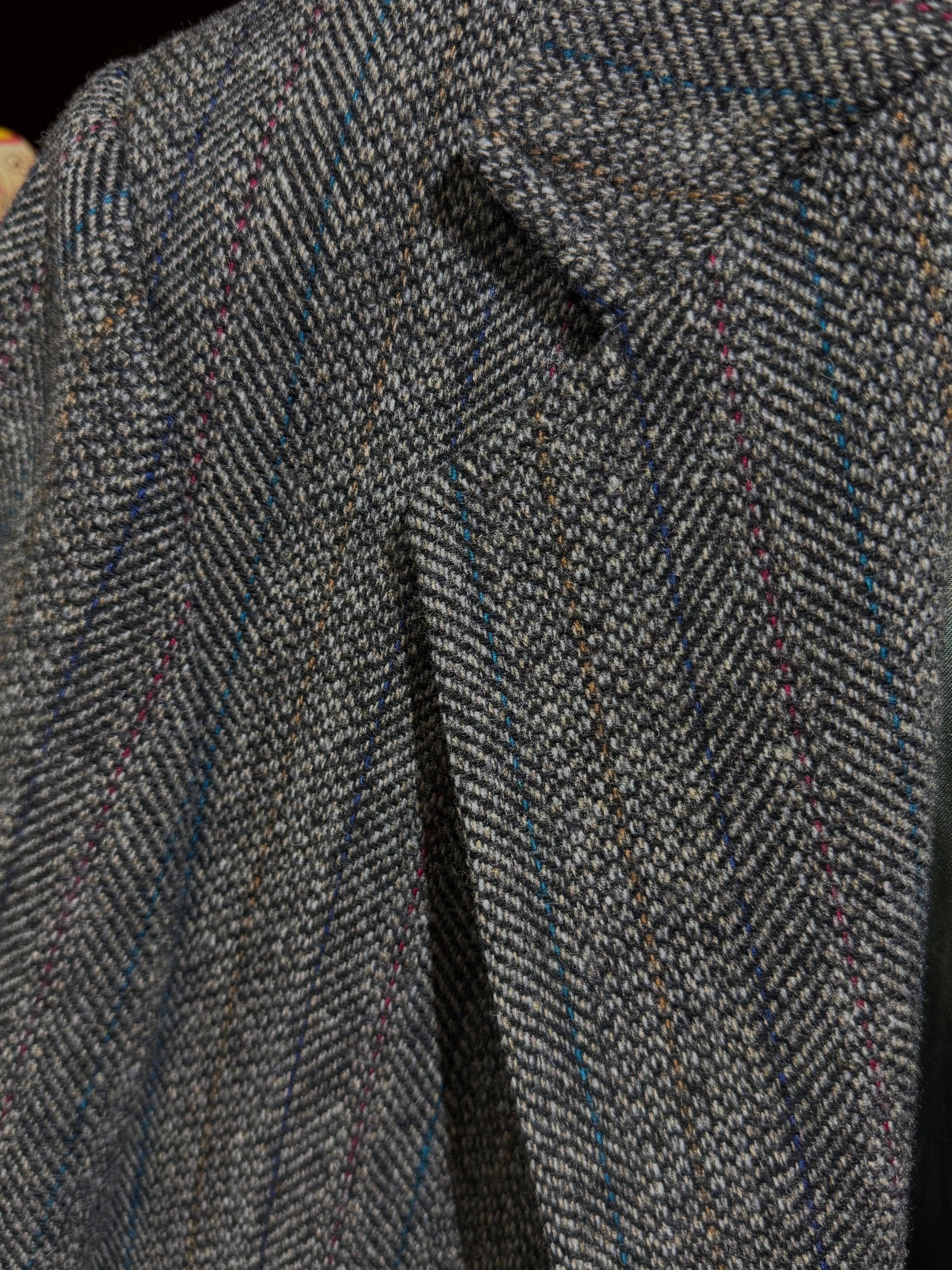 ミディアム×チャコールグレーMIXなグレーヘリンボーン地に、ワイン、ダークブルー、キャメル、ターコイズブルーのピンストライプが入る凝った生地で、表地も裏地もコンディション良好です。