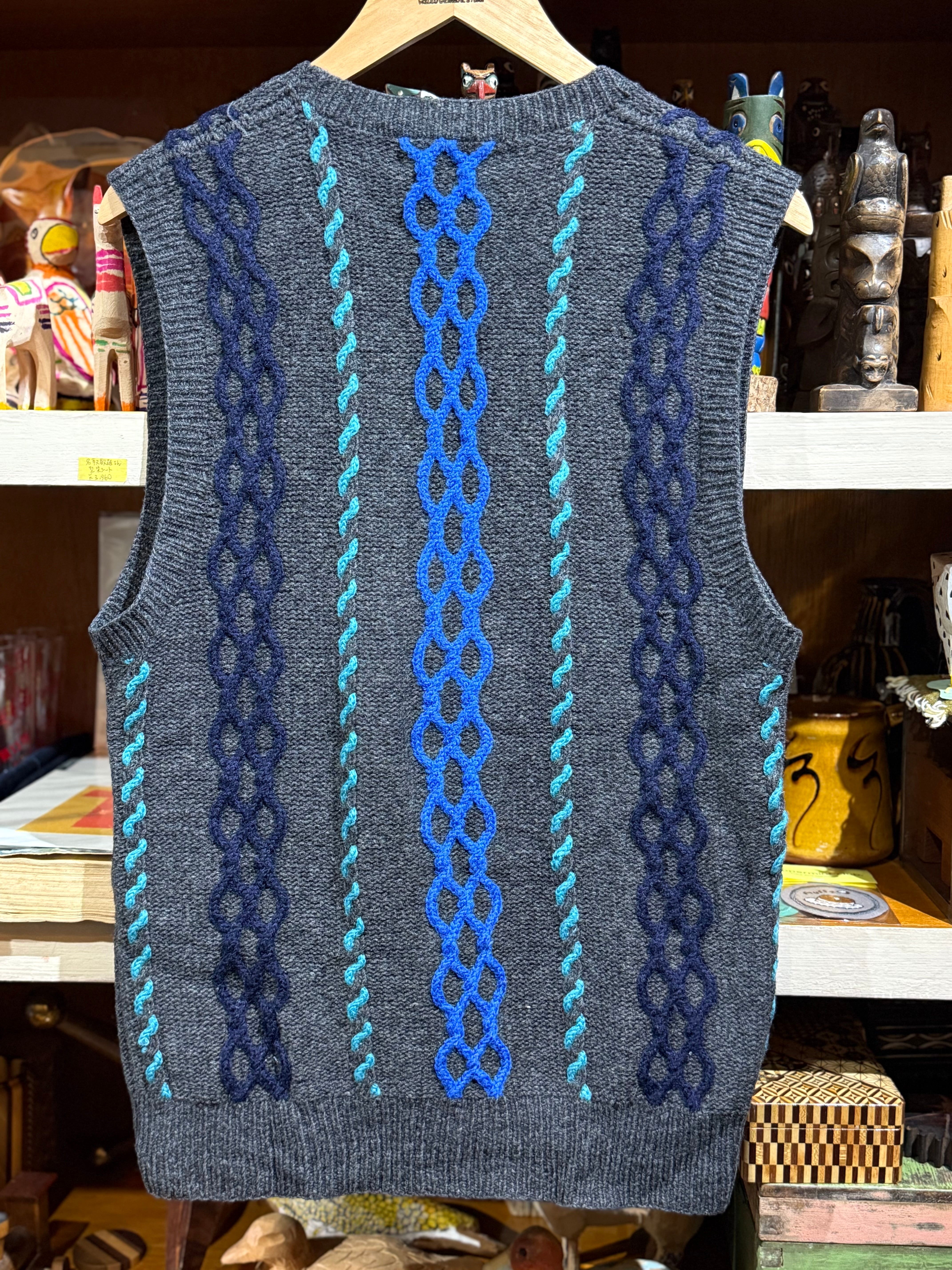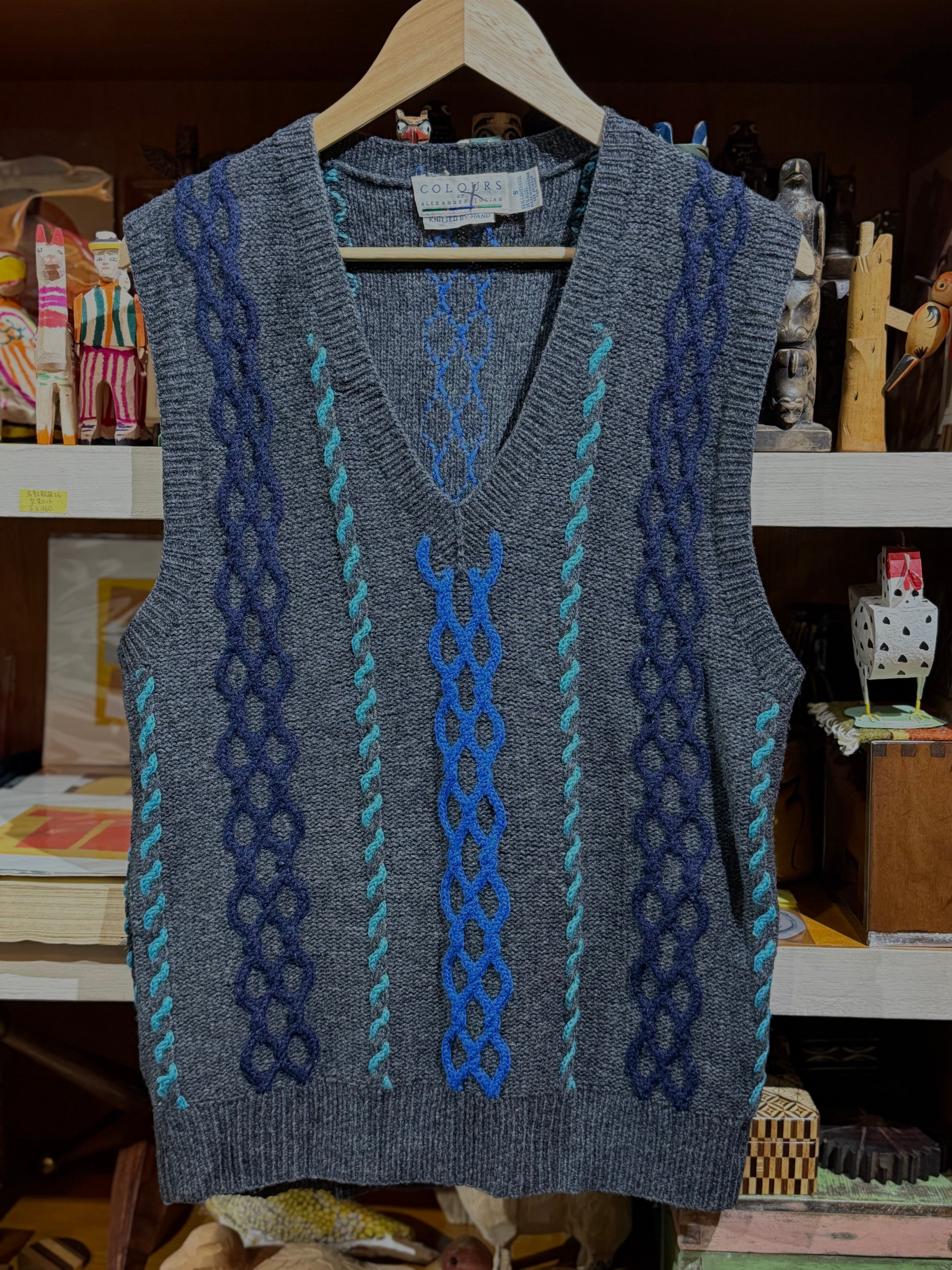 こちらはチャコールグレーベースに、ブルー系3色の挿し色が効果的なハンドニットベスト。