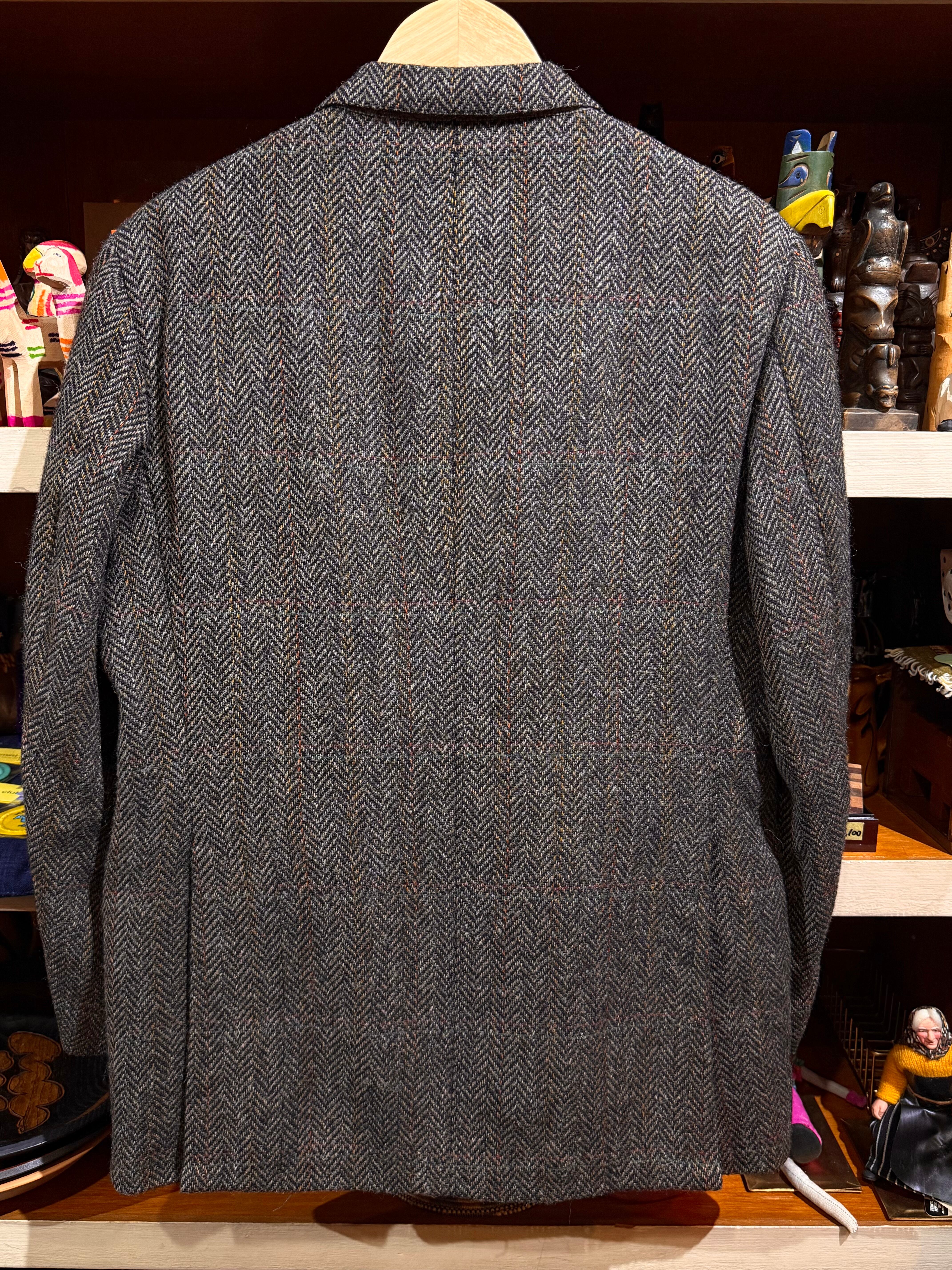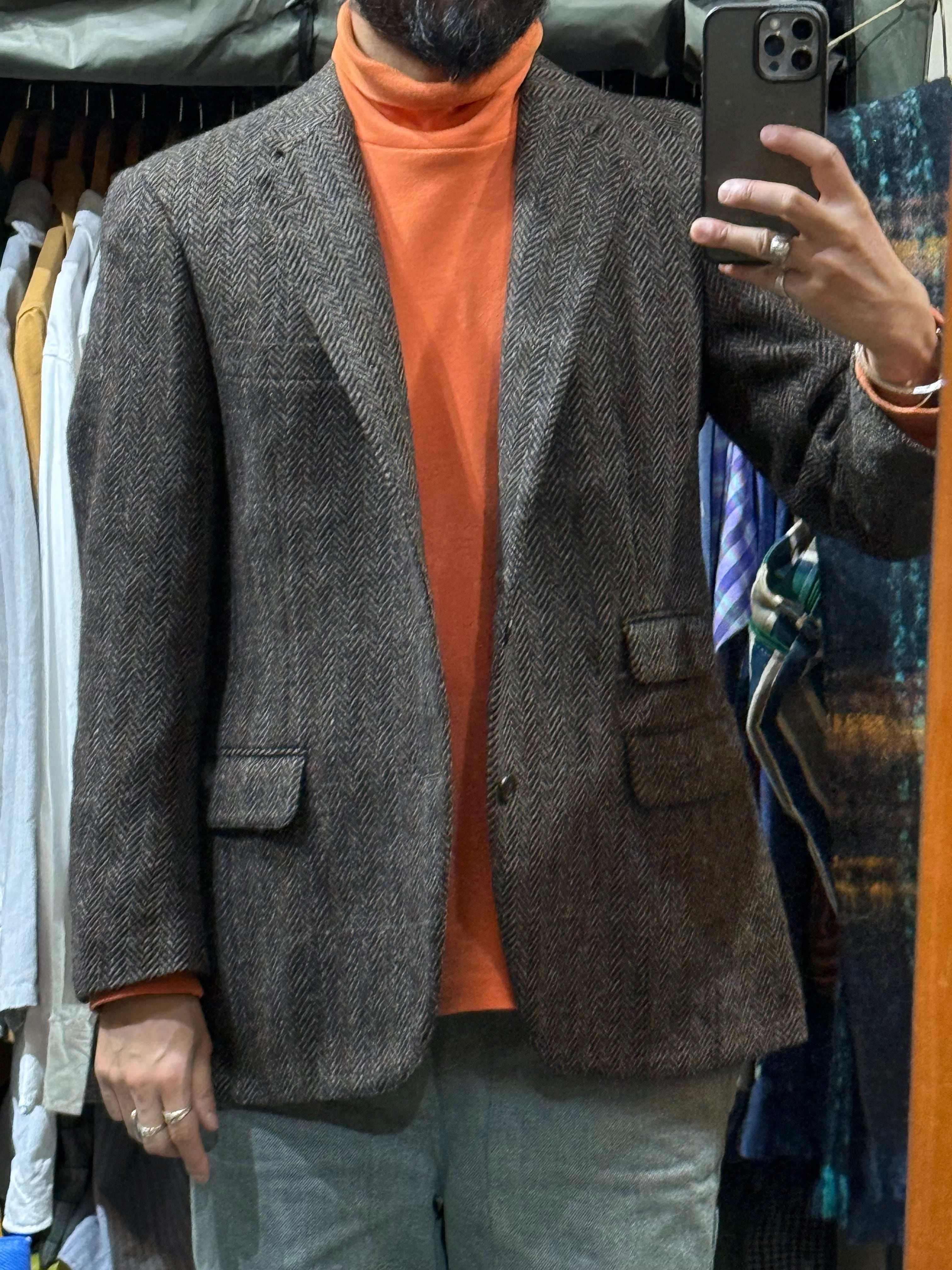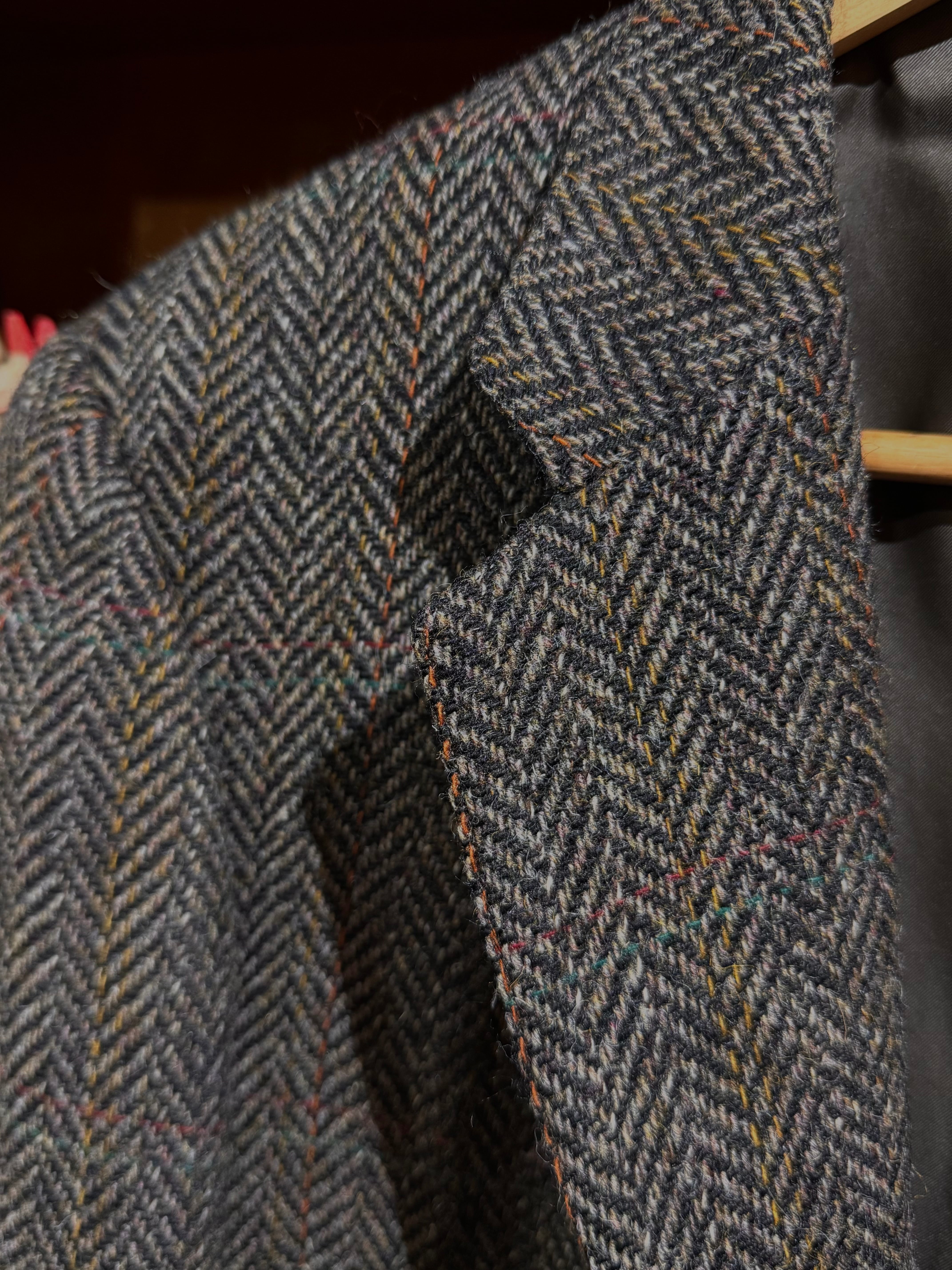 ブラウンのヘリンボーン柄ベースに、カラーネップの挿し色であるようなイエロー、オレンジ、レッド、グリーンがさり気なくチェックで入る凝ったツイード調な生地です。
