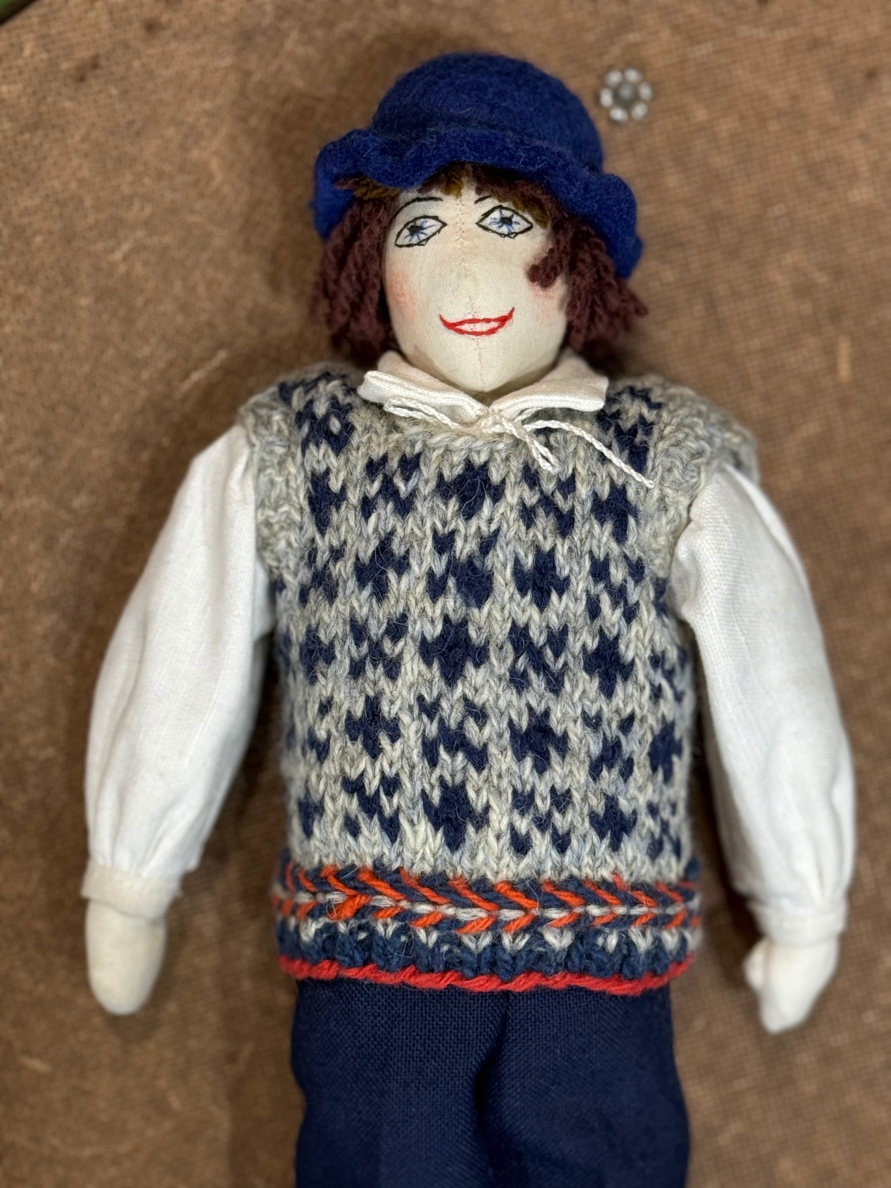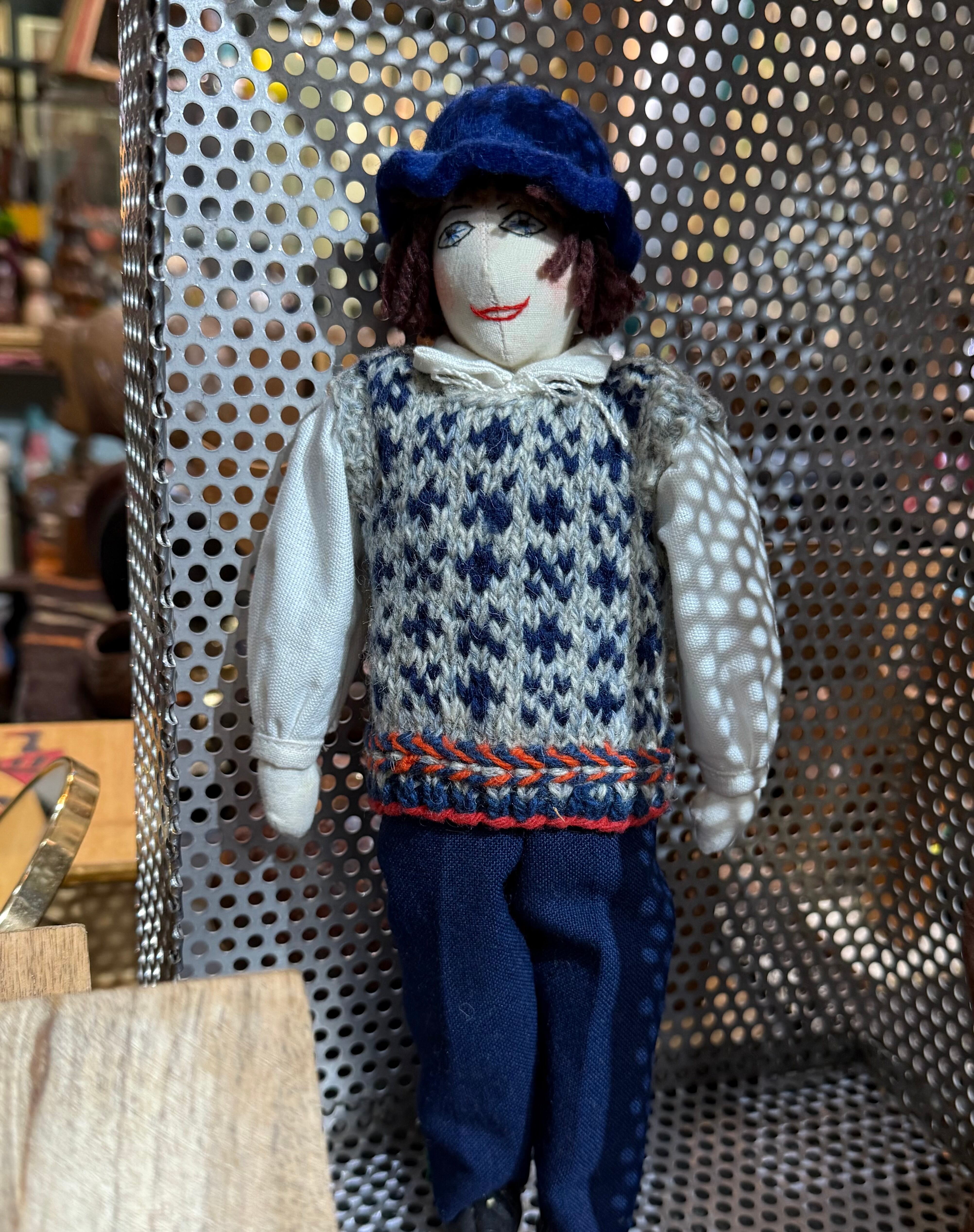 ボディは布張りで、柄までキチンと編まれているニットや、ウールフェルトのハット、革製の靴までコーディネートの良さ含め、とても丁寧な作りです。