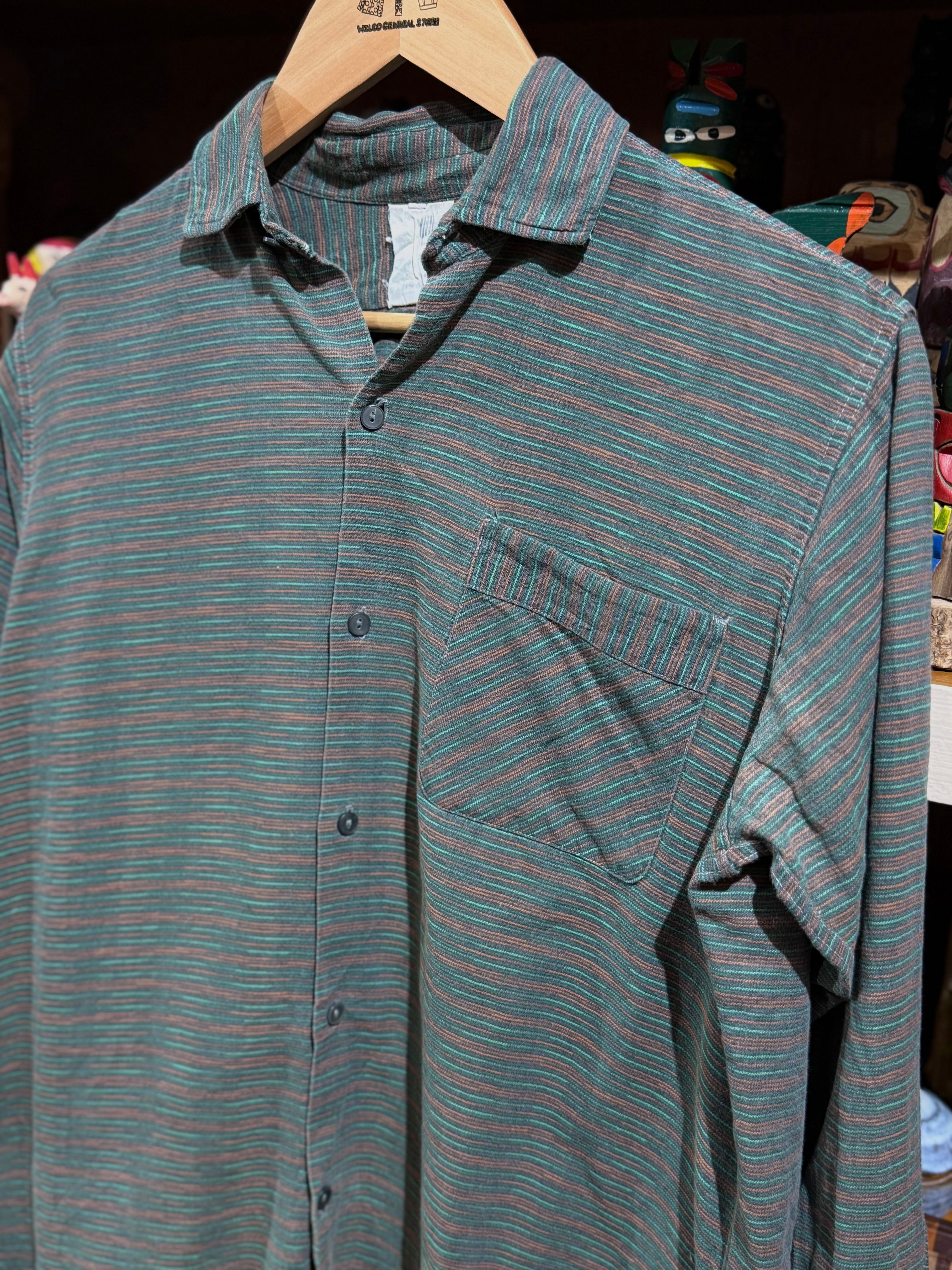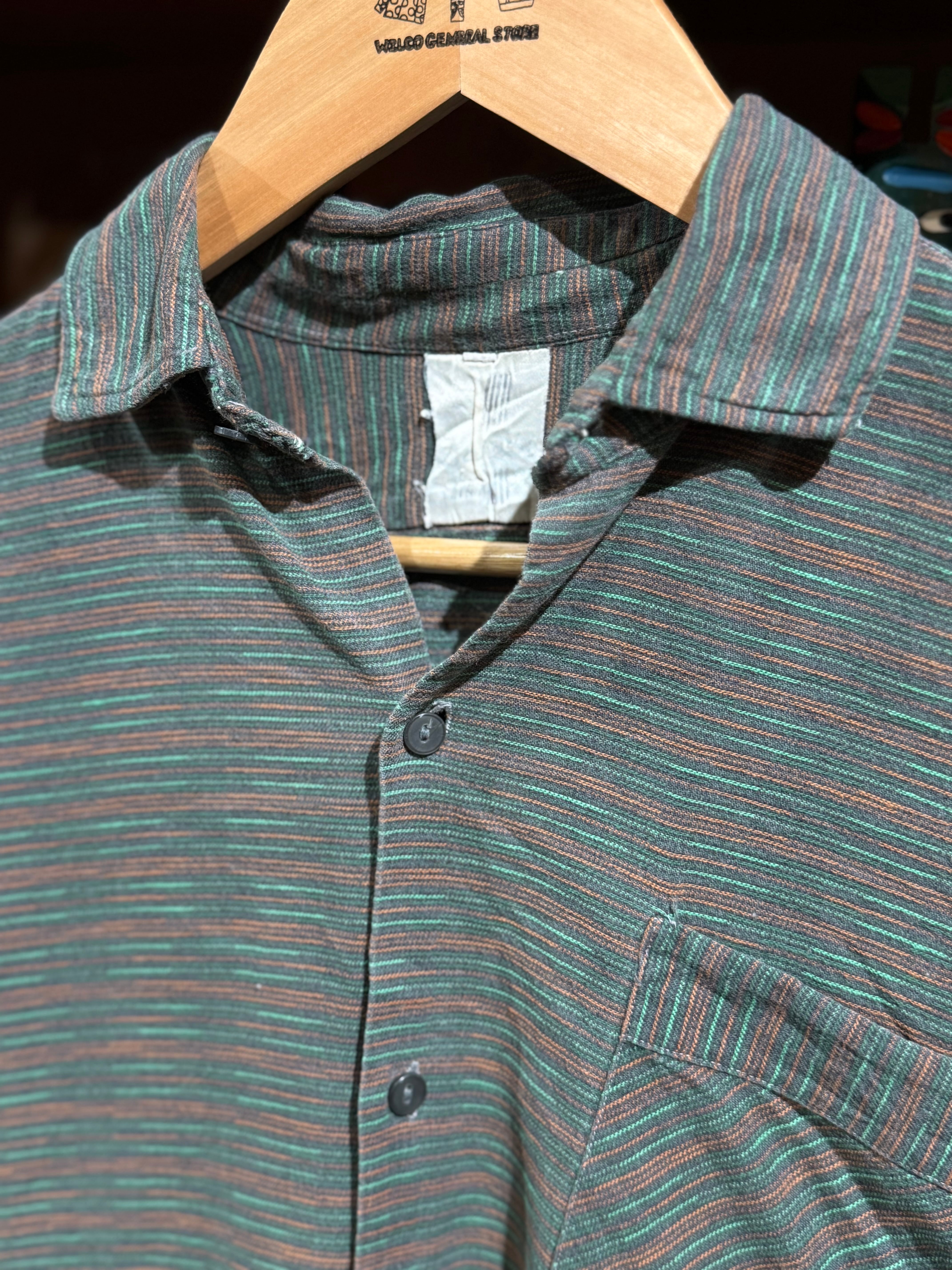 ベースは、スモーキーなグリーンとブラウン系の変わり種ボーダー柄。グランパシャツでありそうな風合い豊かな生地です。
