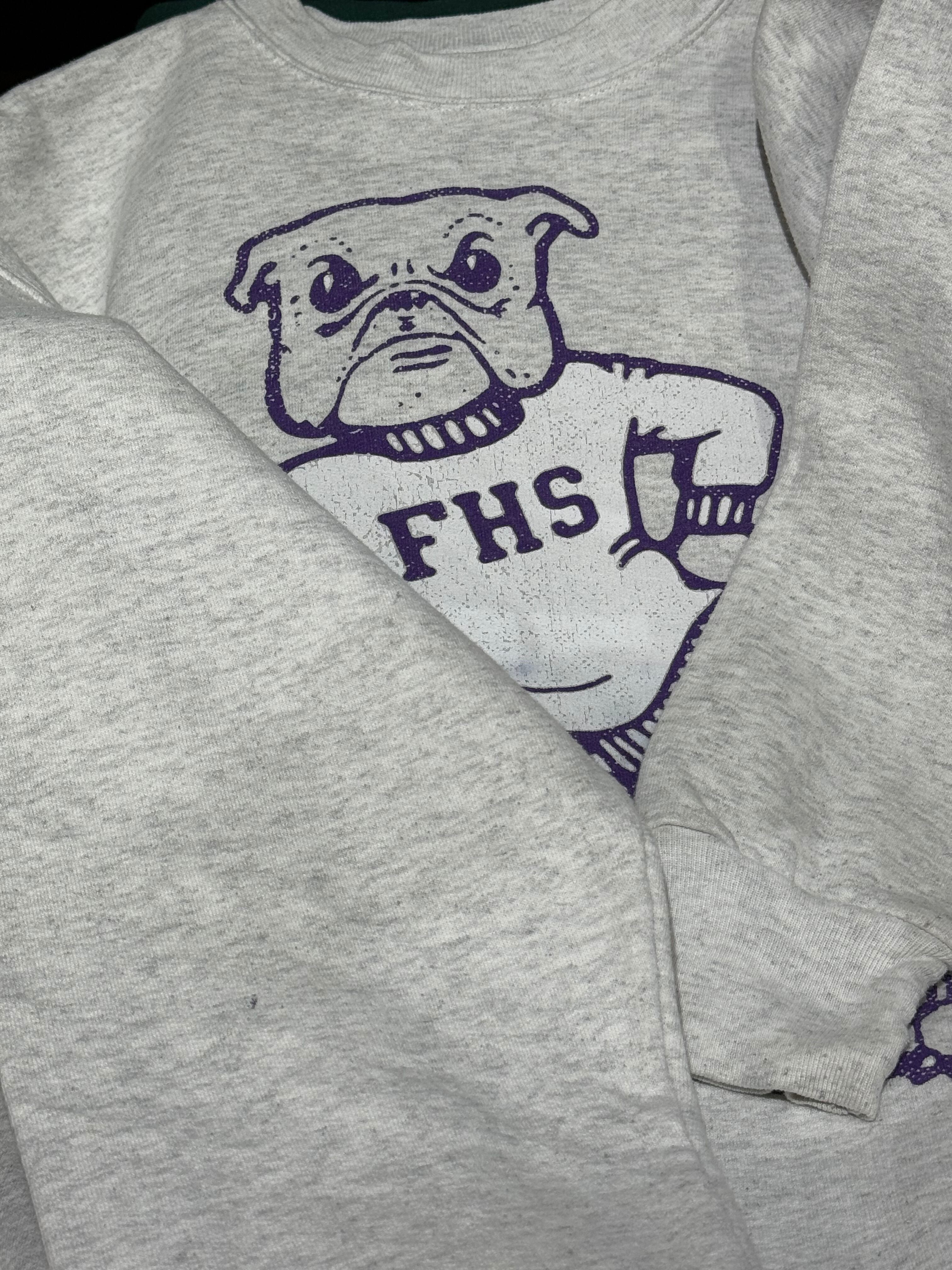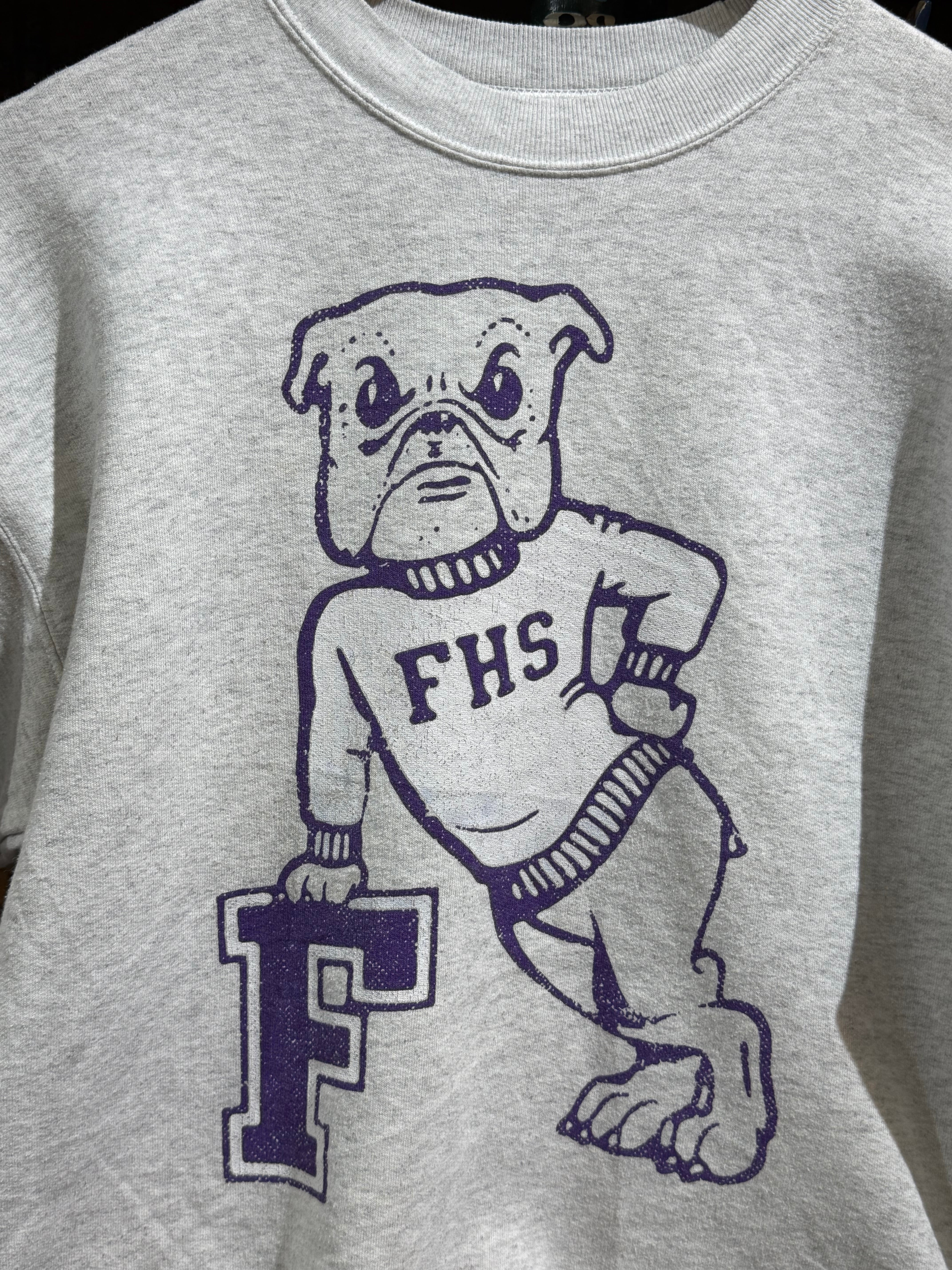 ライトグレーの霜降りボディに、パープルのブルドッグプリントが映えるスエット