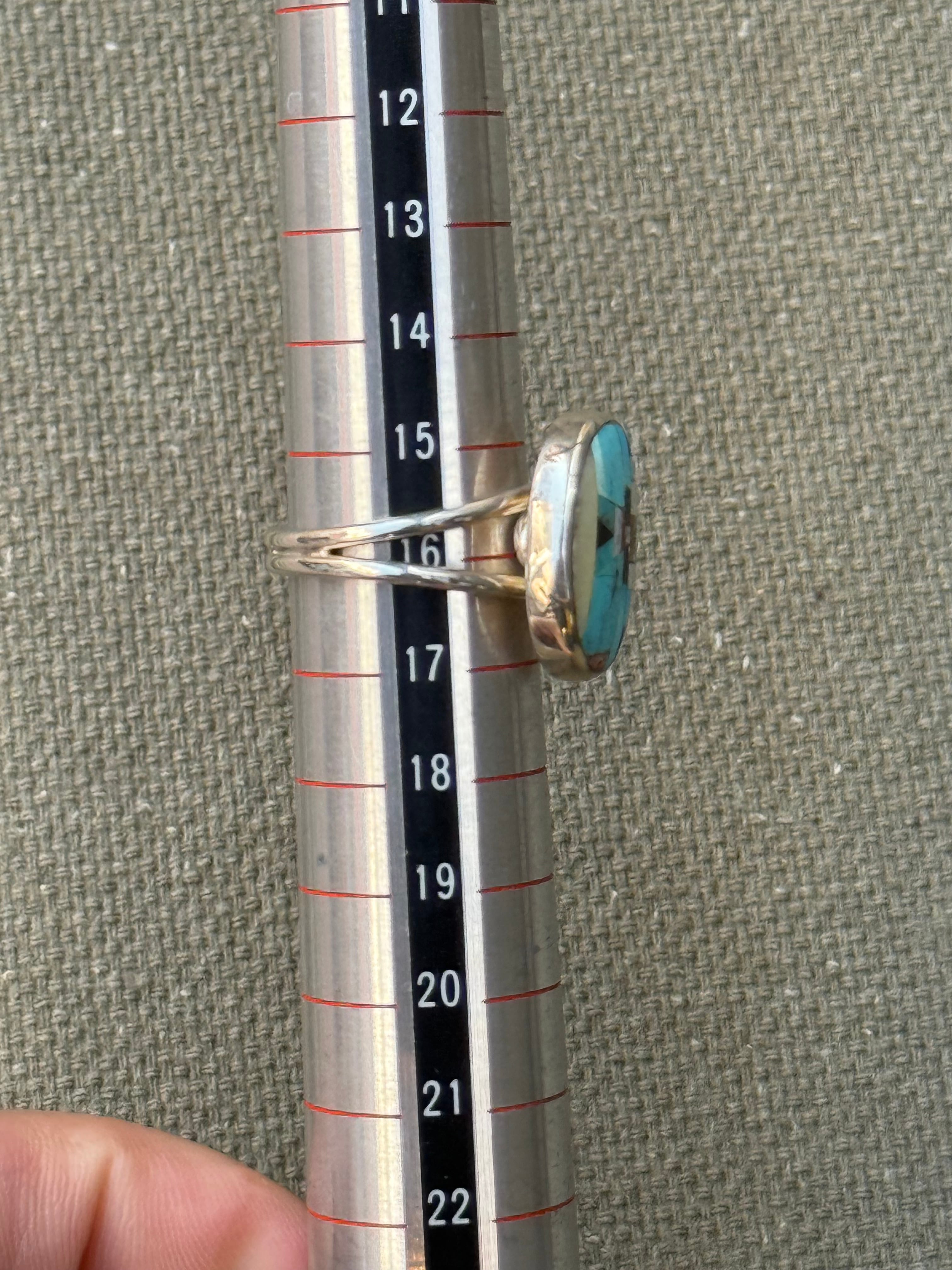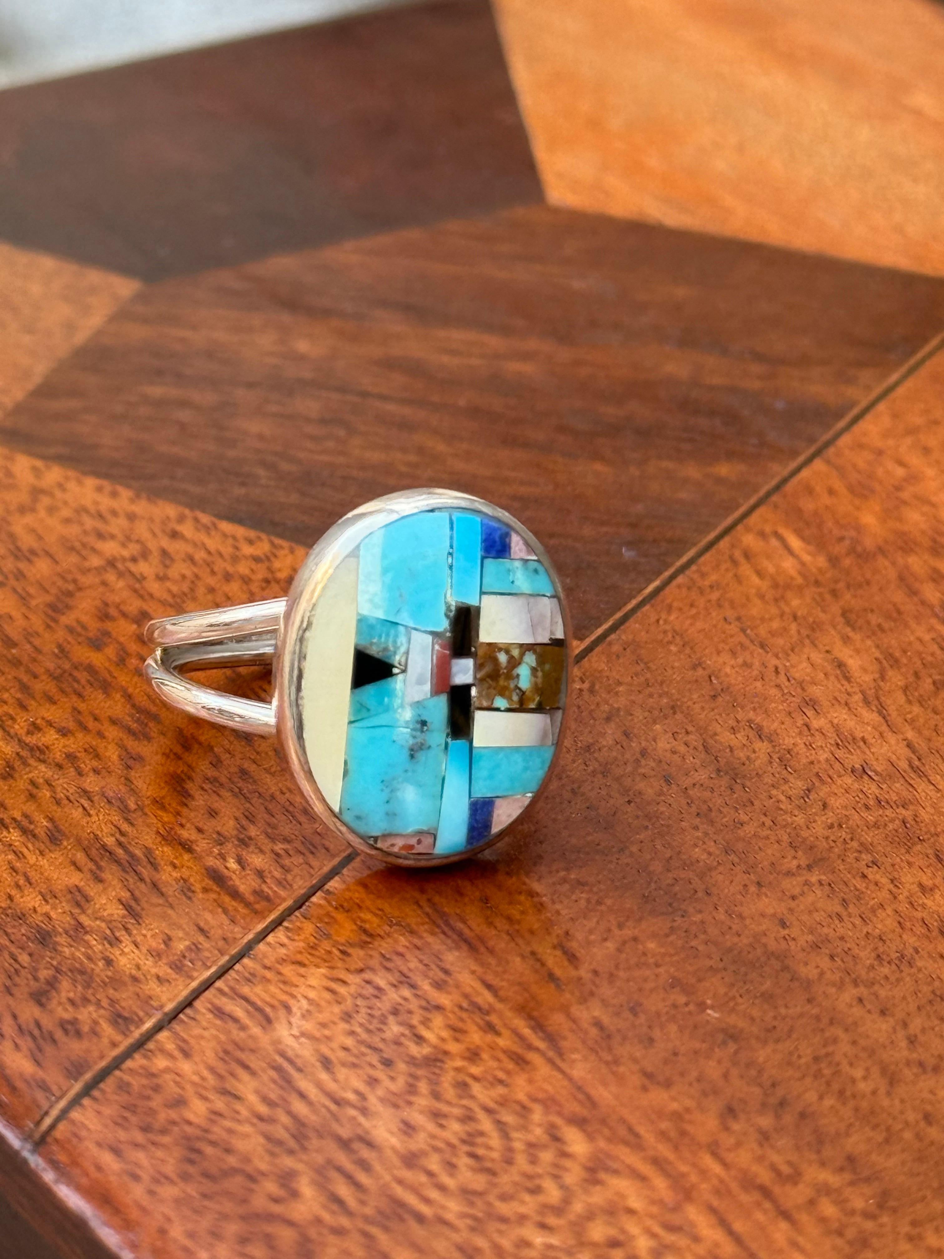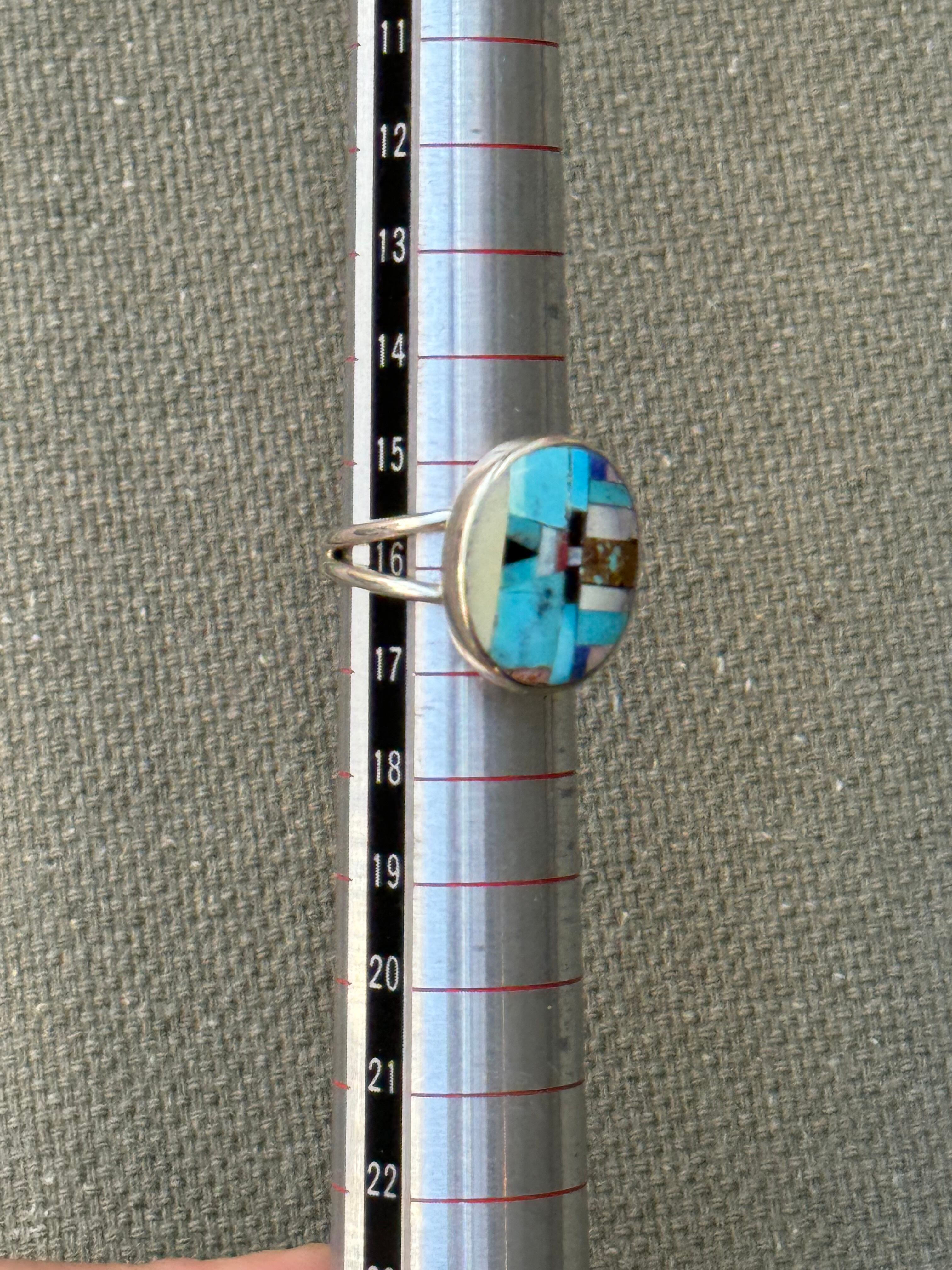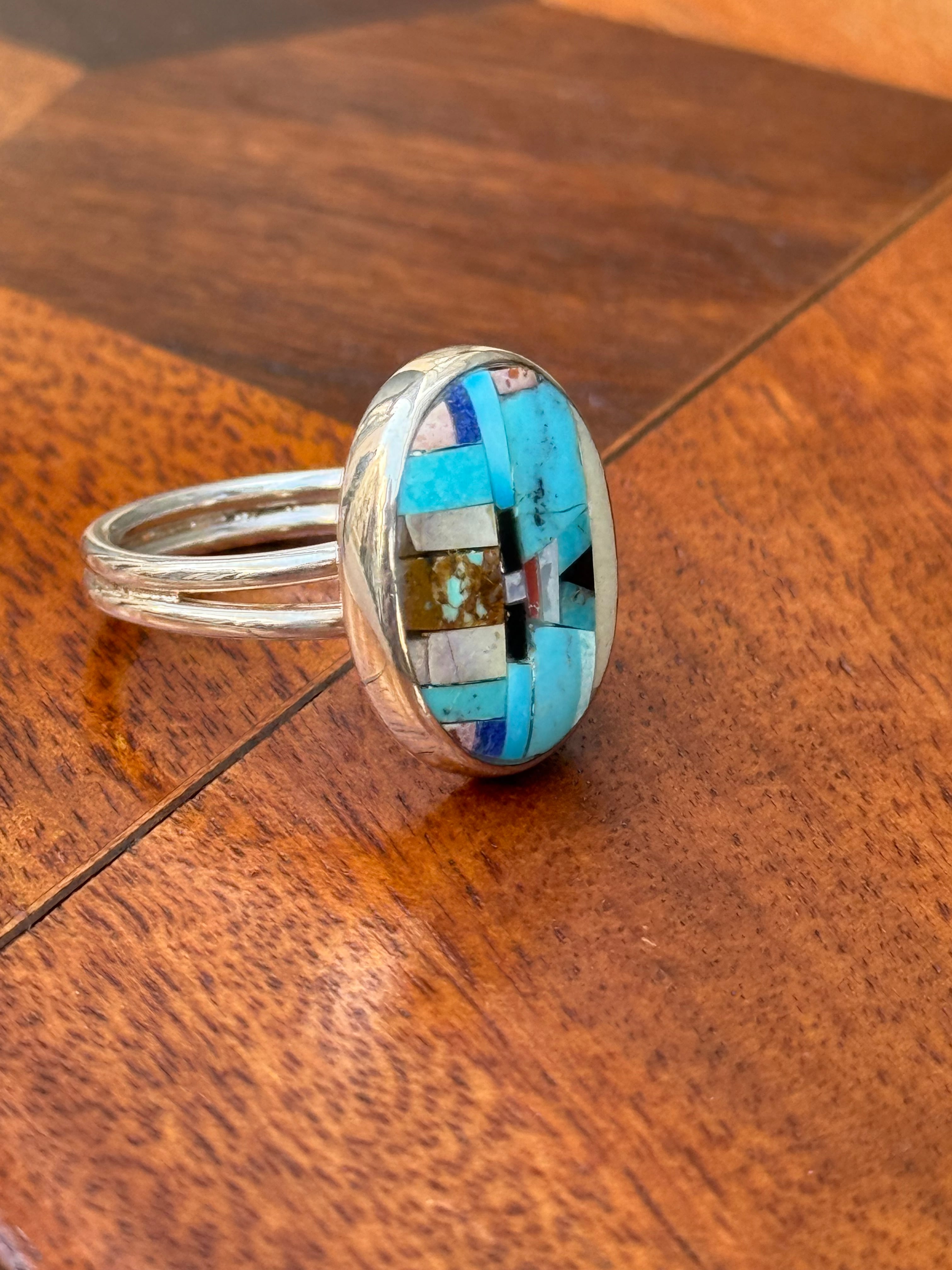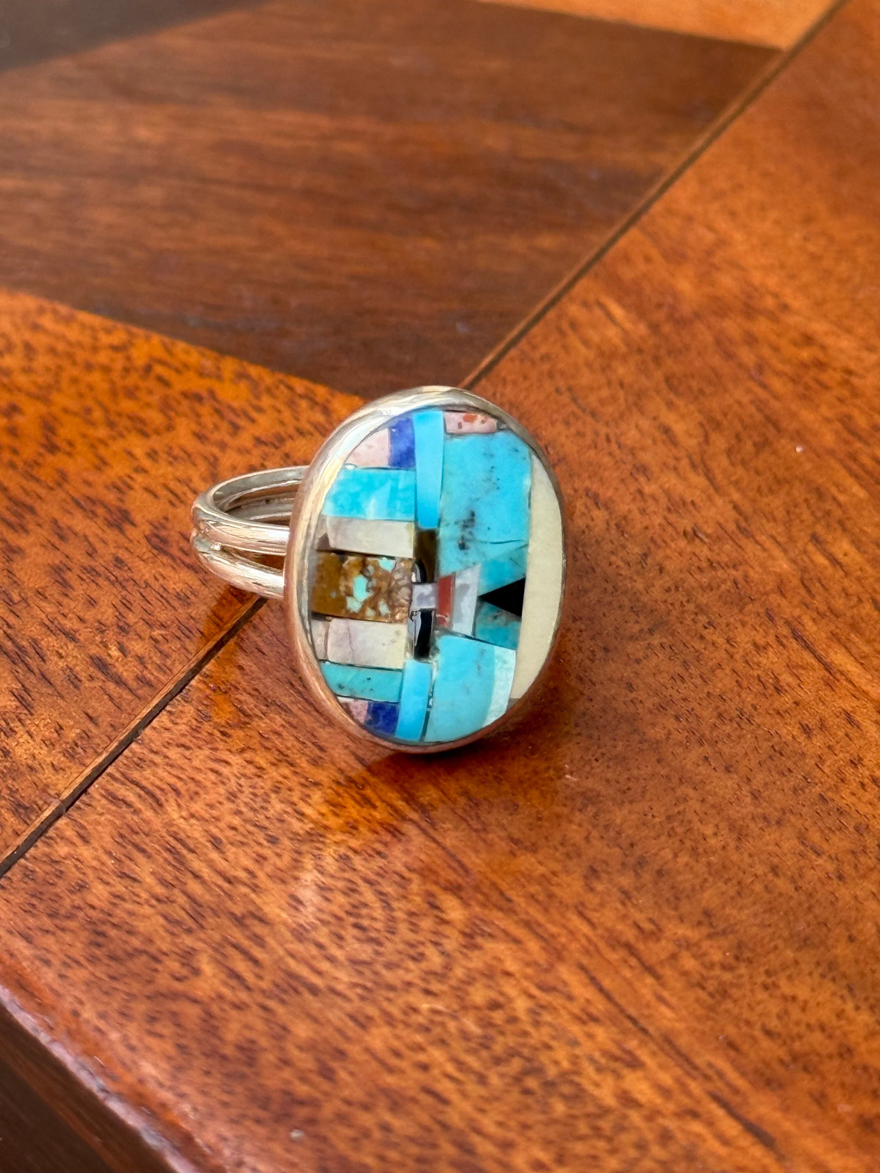ターコイズなどの石がモザイク状にインレイで表現されたメキシコ製のシルバーリングです。
