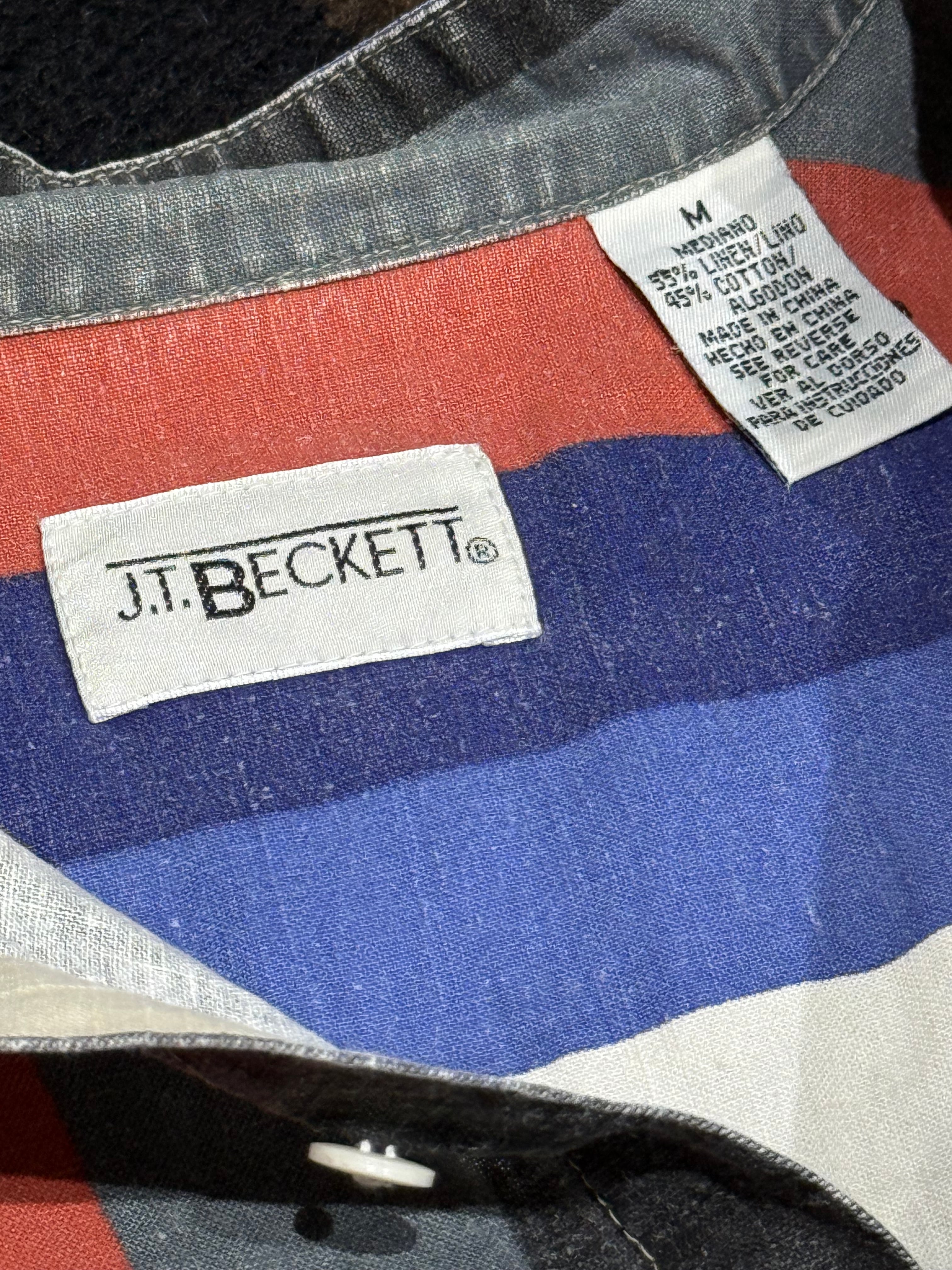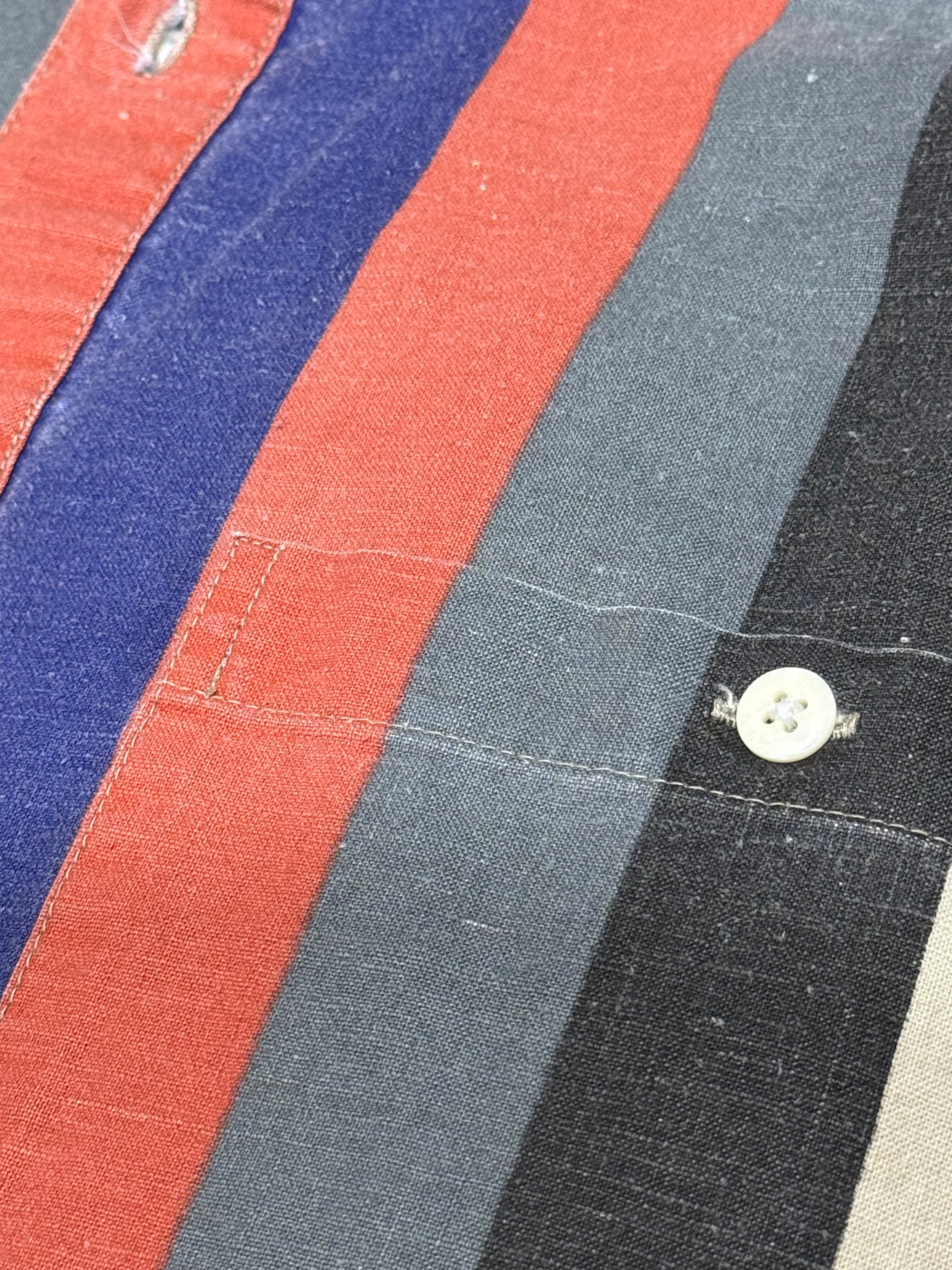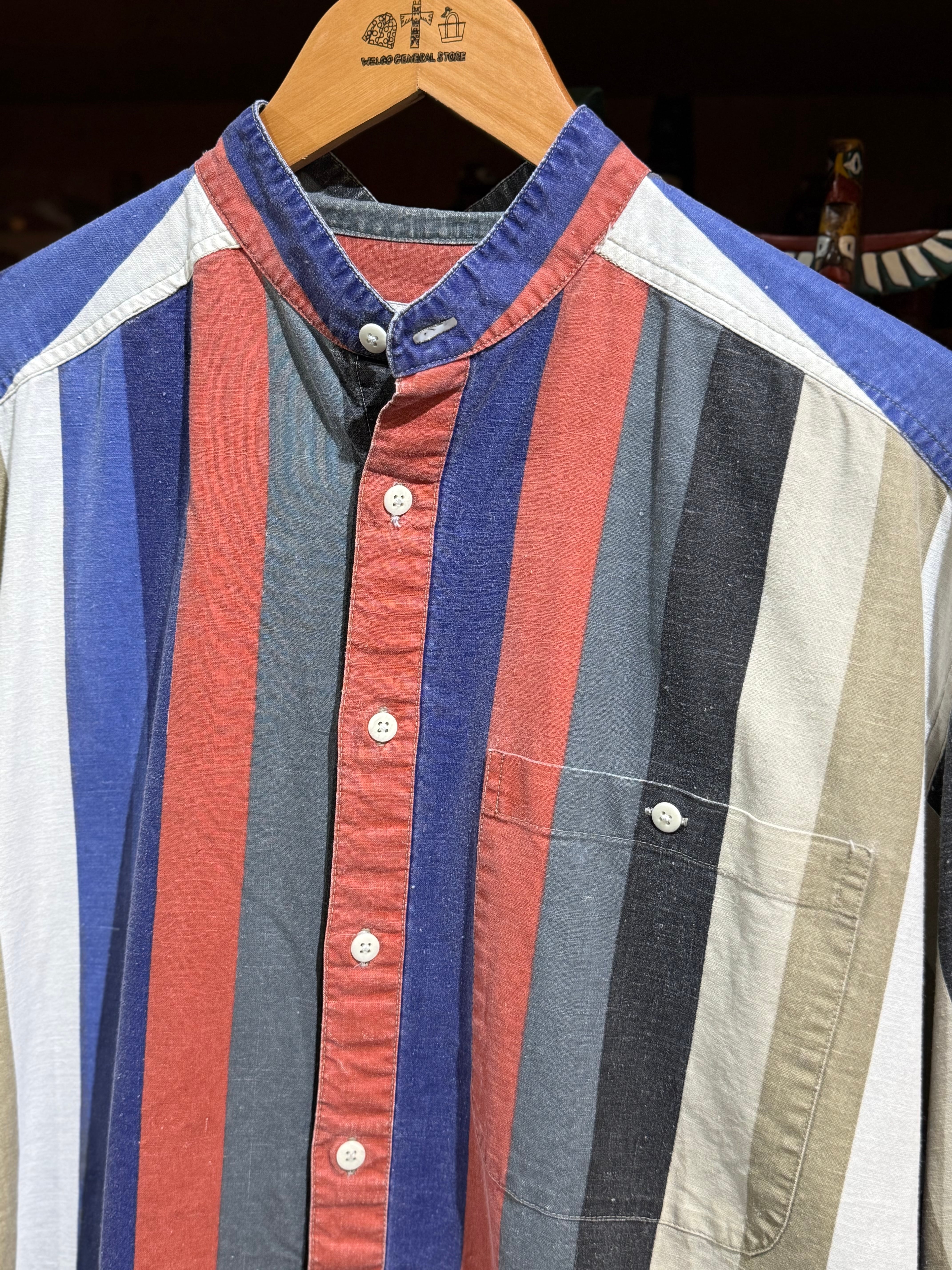 ブランドに関する情報がなく詳細不明ですが、リネン混のスラブ調生地感のマルチストライプ、バンドカラーと、一枚で存在感のあるシャツです。